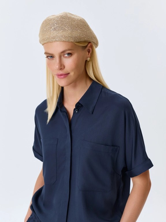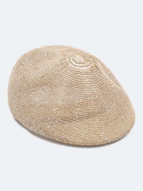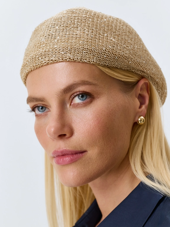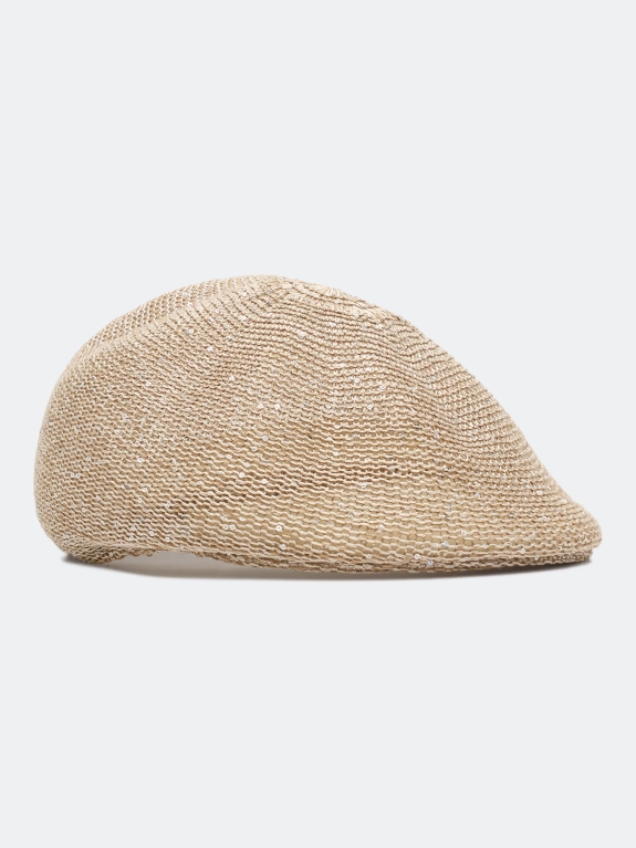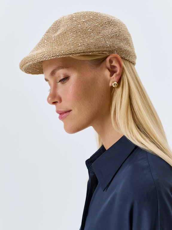 Элегантная вязаная кепи. Широкий изогнутый козырек немного опущен вниз. Дополнена деликатными пайетками. Регулировка размера с помощью внутренней кулисы.