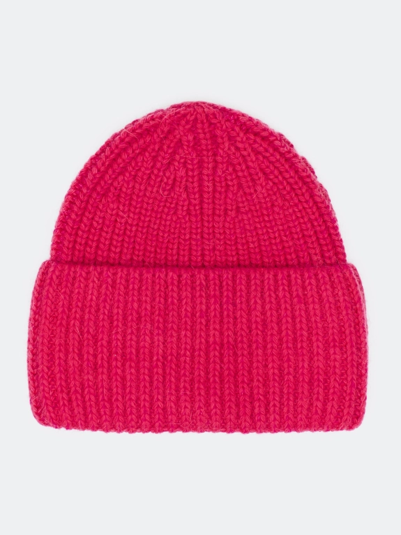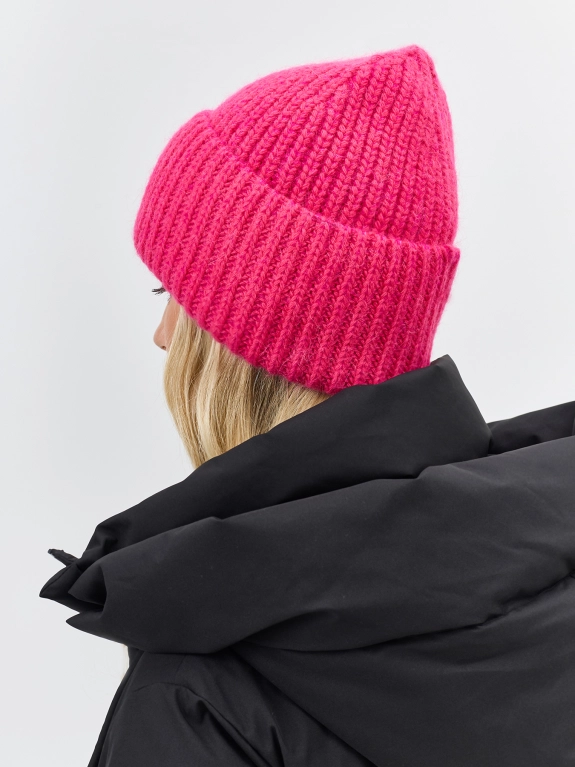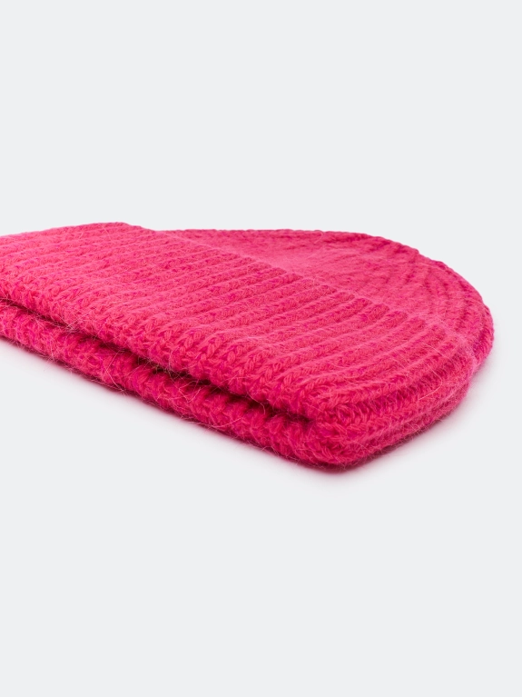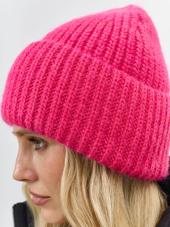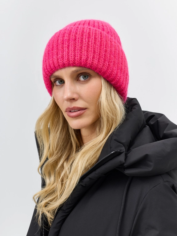 Базовая шапка бини в рубчик. Дополнена широким отворотом. В составе вискоза и ангора.