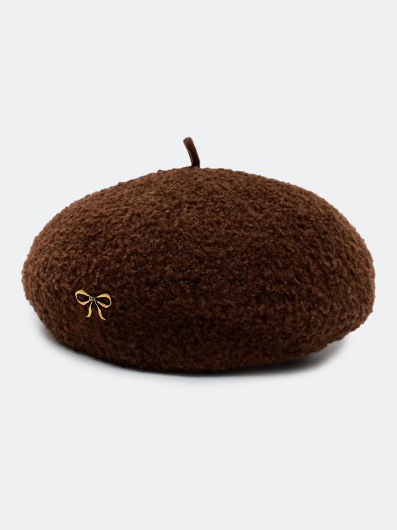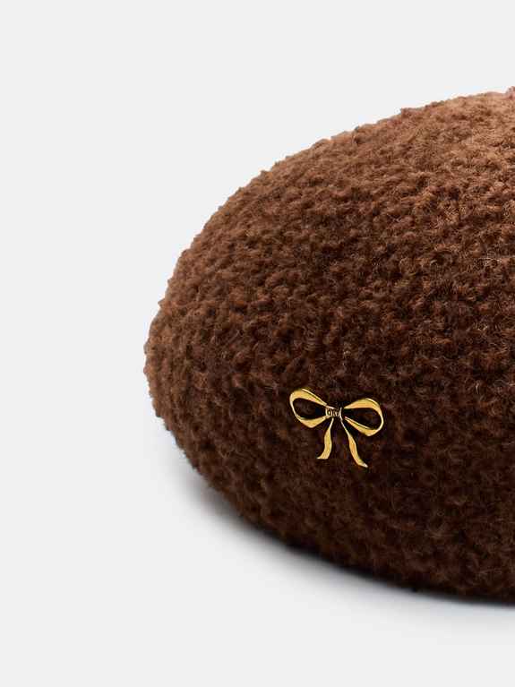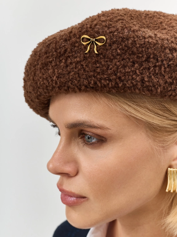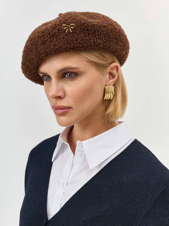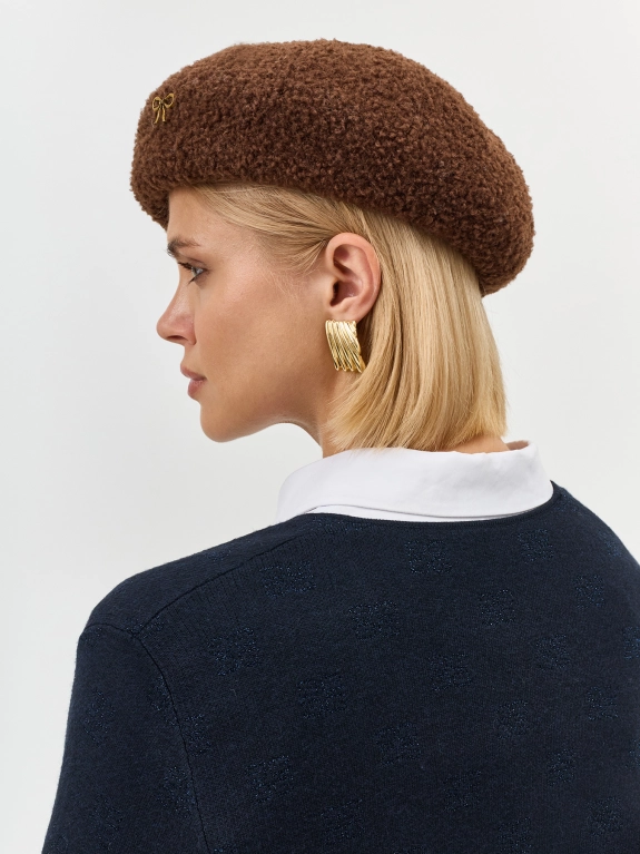 Берет с минималистичным металлическим декором из буклированного фактурного трикотажа. Дополнен рибом по внутренней стороне.