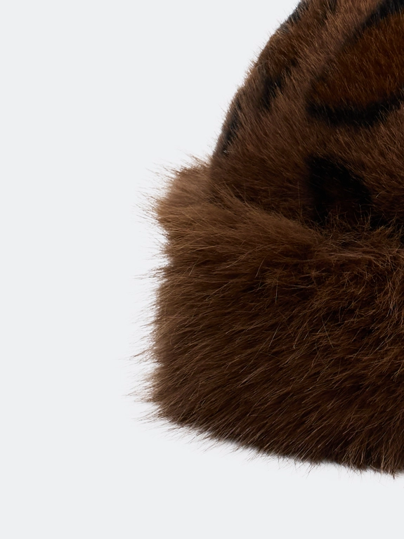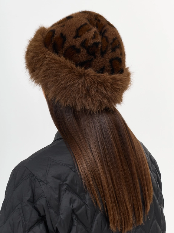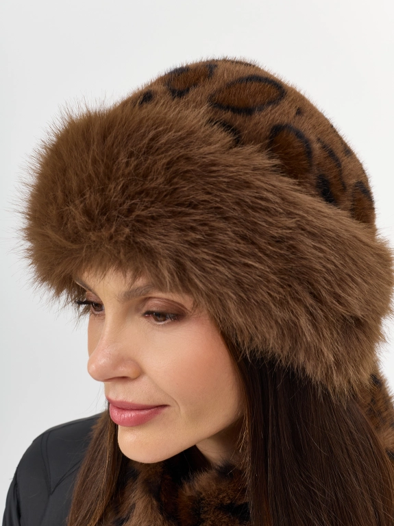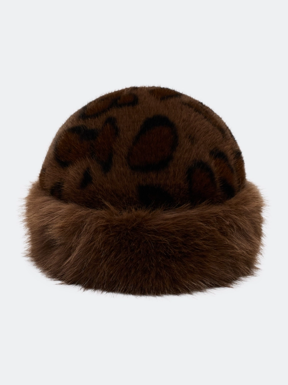 Шапка из искусственного меха с анималистичным принтом. Широкая меховая опушка. Дополнена рибом по внутренней стороне для лучшей фиксации и регулировки размера.