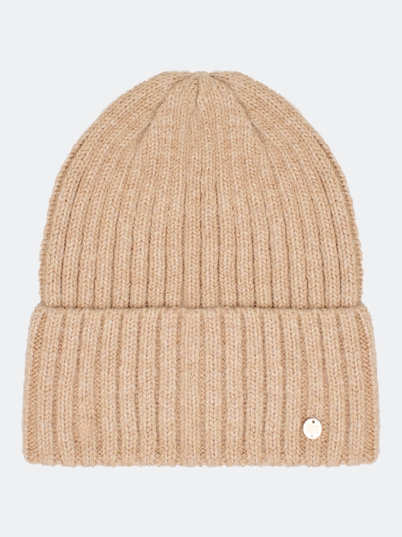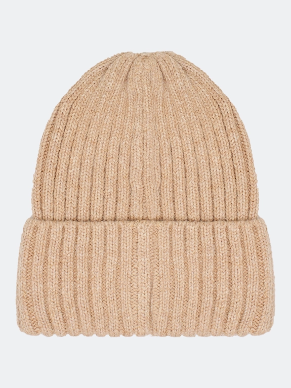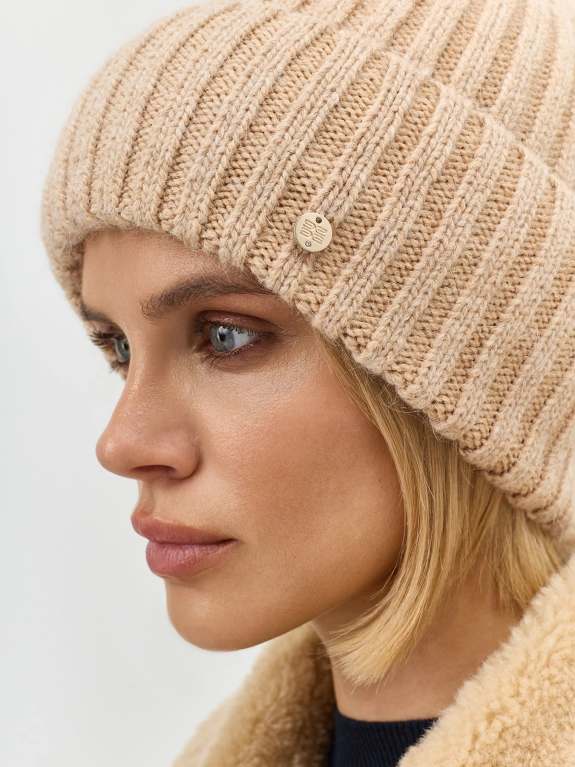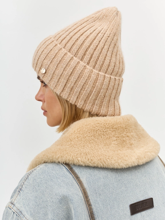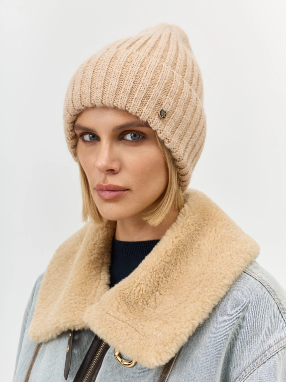 Объемная шапка бини в широкий рубчик. Дополнена отворотом с акцентным декором. В составе вискоза, ангора и шерсть.