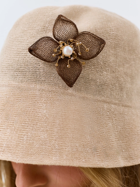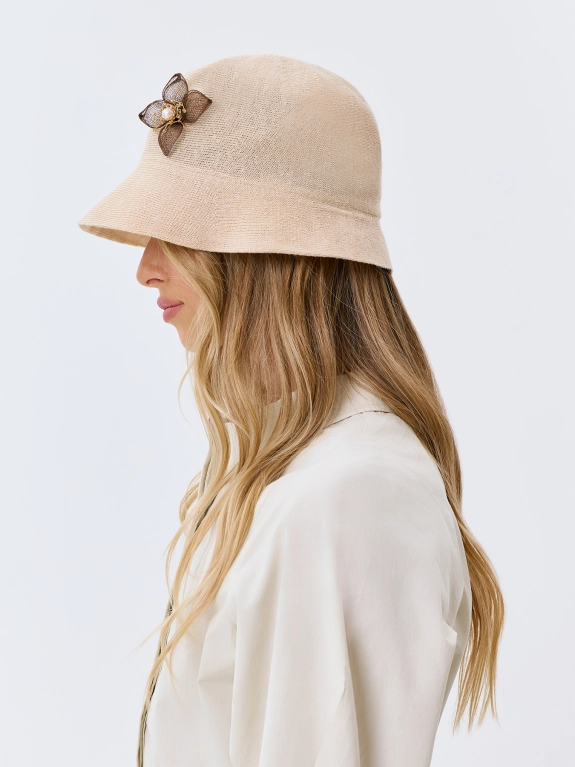 Классическая панама из 100% льна. Закругленная тулья и короткие загнутые вверх поля. Дополнена акцентным декором. Регулировка размера с помощью внутренней кулисы.