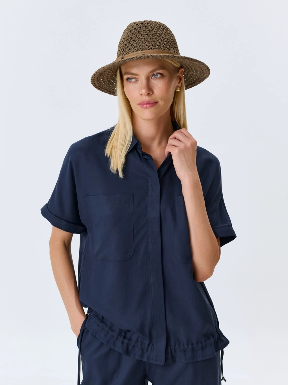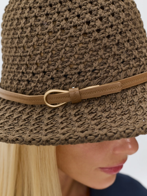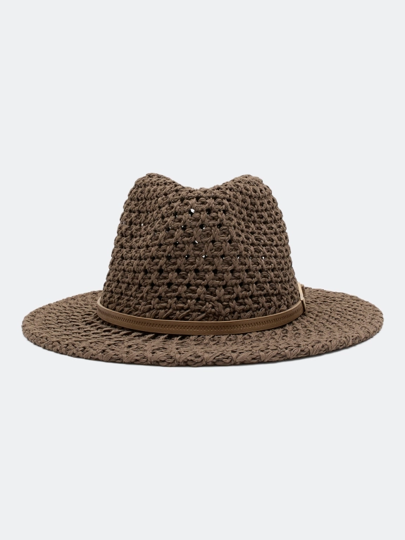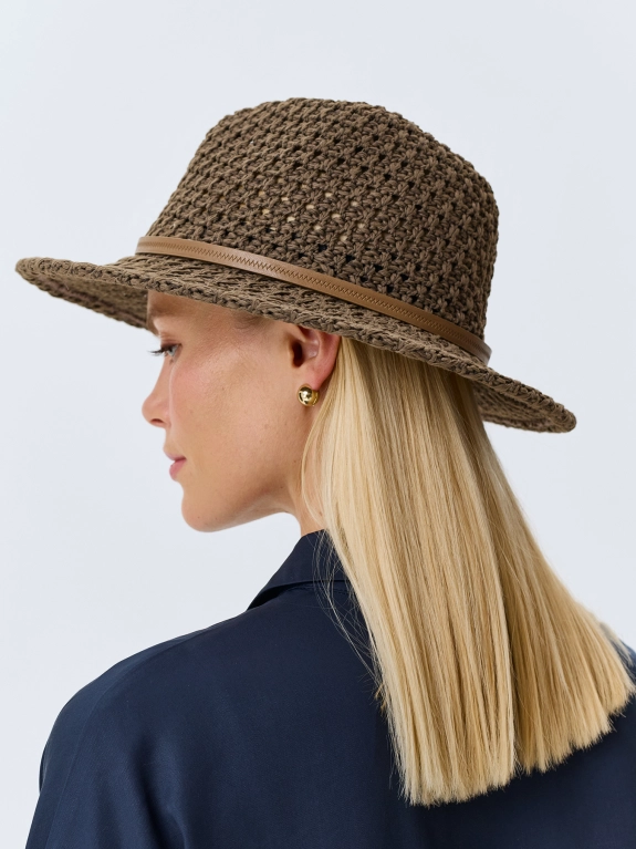 Шляпа с широкими прямыми полями. Выполнена в технике ажурного плетения "елочка". Дополнена декоративным ремешком. Регулировка размера с помощью внутренней кулисы.