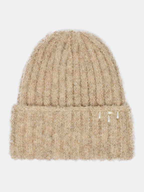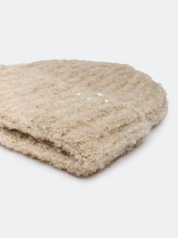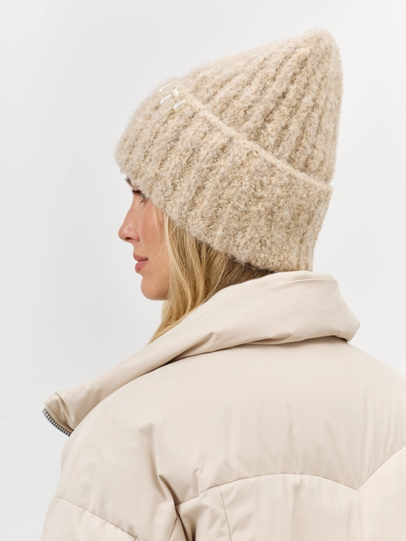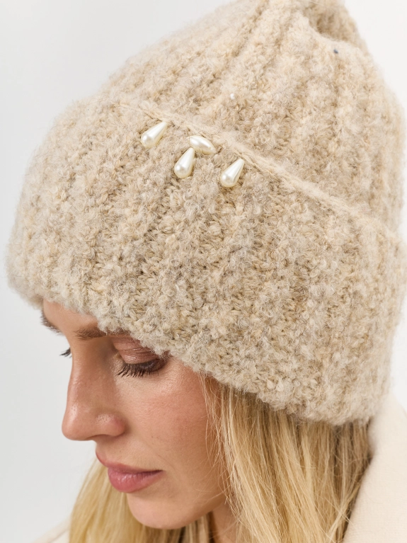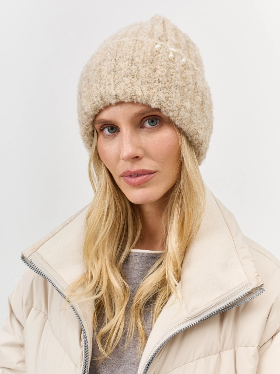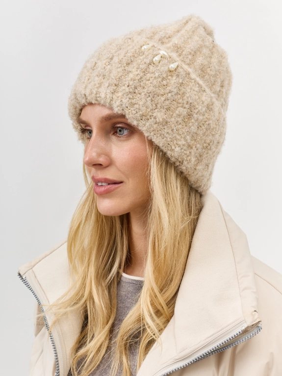 Пушистая шапка из буклированной пряжи с деликатным декором по широкому отвороту. Отделка в широкий рубчик. В составе шерсть и ангора. Деликатный декор из бусин на отвороте.