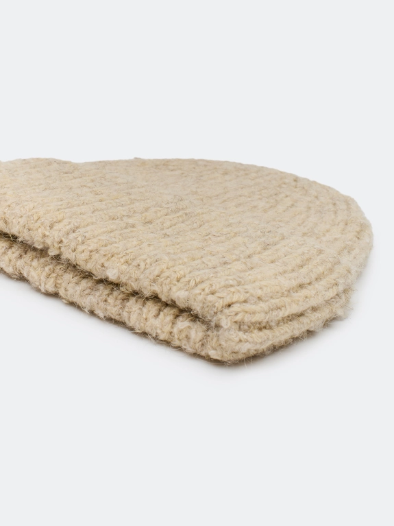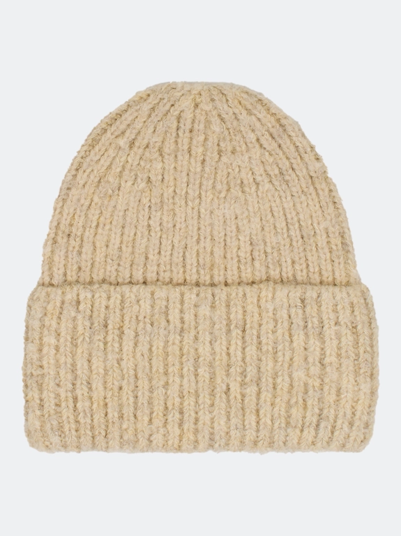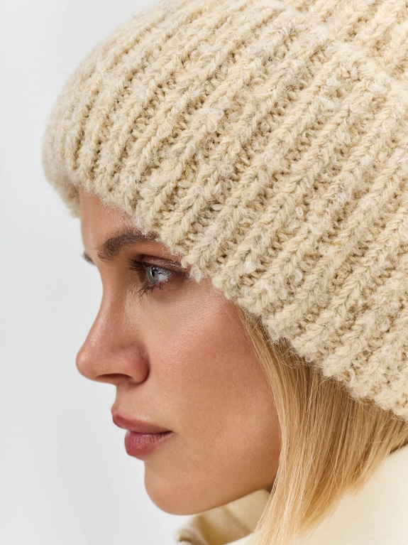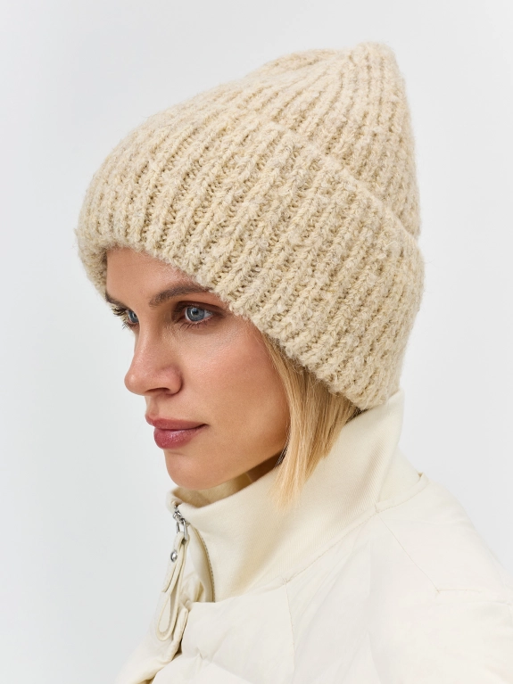 Шапка бини в рубчик из объёмной пряжи с эффектом букле с ангорой в составе. Дополнена широким отворотом и брендированным шильдом.