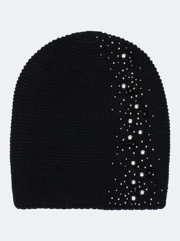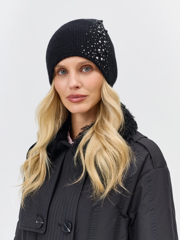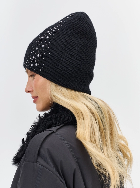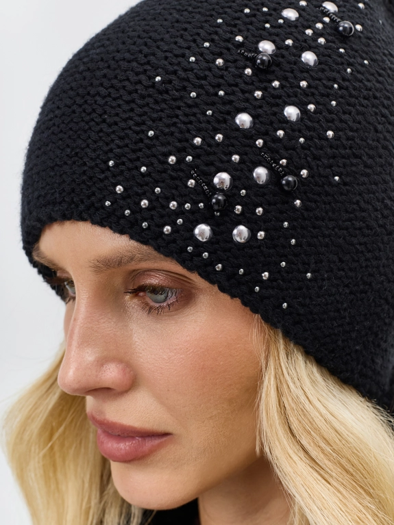 Шапка с декором из мерцающих страз и жемчужин. В составе ангора и вискоза.
