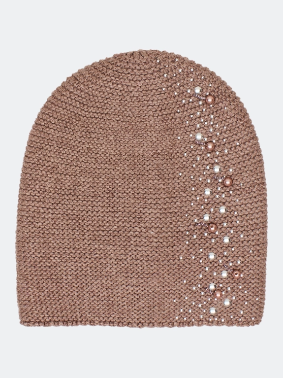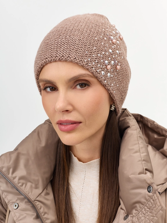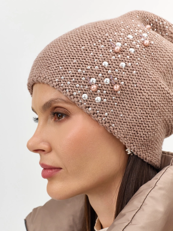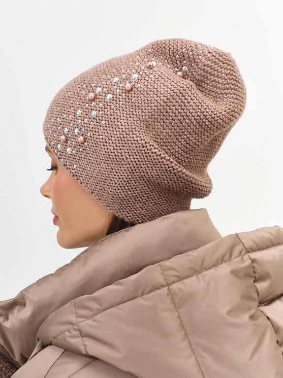 Шапка с декором из мерцающих страз и жемчужин. В составе ангора и вискоза.