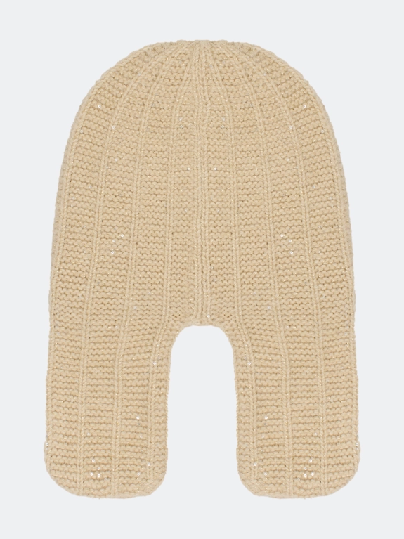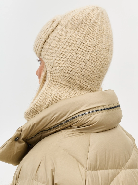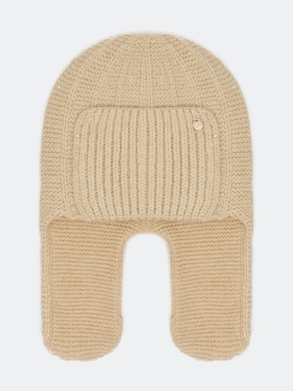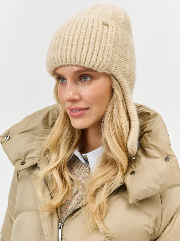 Шапка-ушанка с ангорой в составе. Отделка в рубчик. Дополнена широким отворотом и деликатным брендированным шильдом.