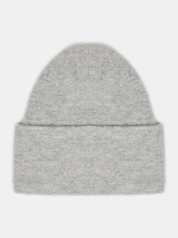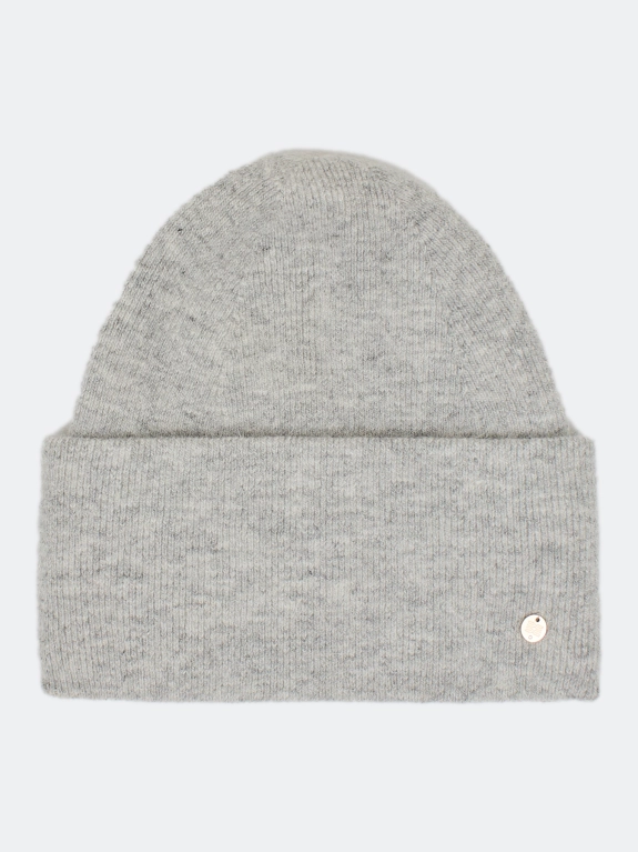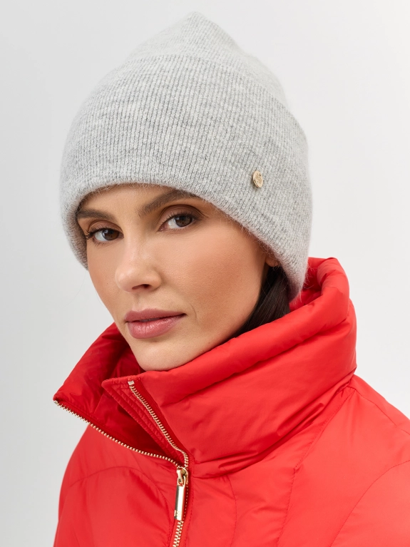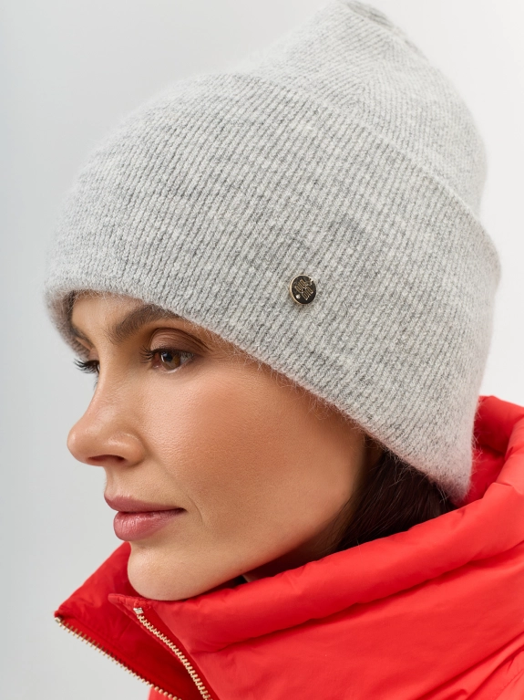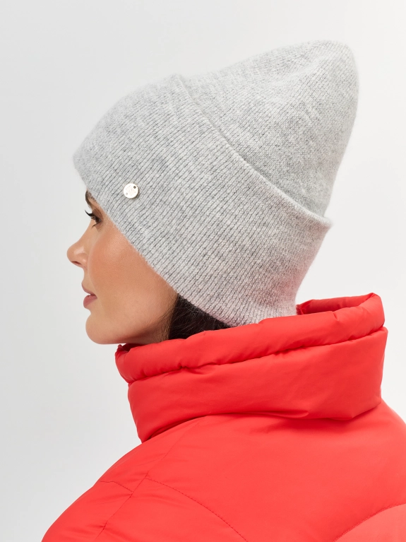 Шапка бини в рубчик. Дополнена декоративным металлическим декором на широком отвороте. В составе вискоза и ангора.