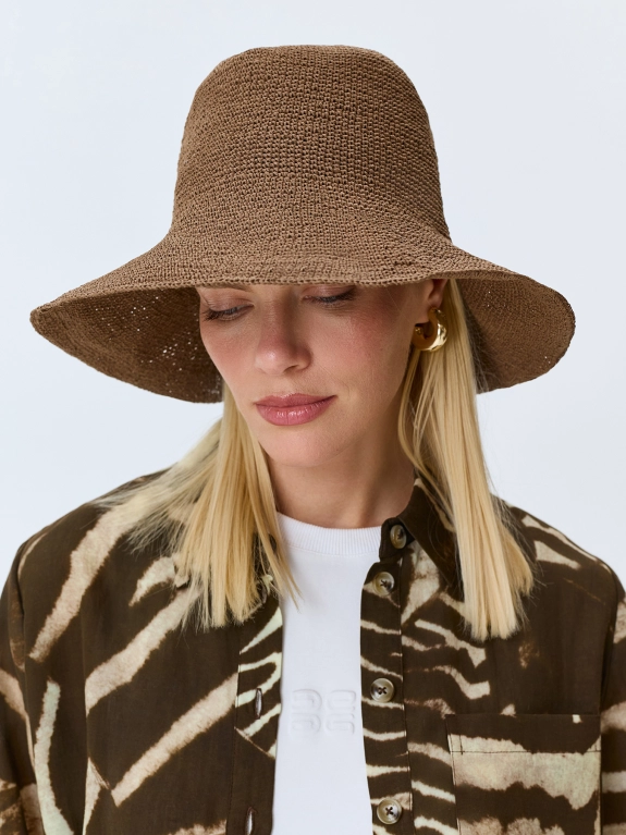 Шляпа-котелок из натуральной бумажной соломки. Плетеная шляпа с округлой тульей и широкими полями с каркасом, благодаря которому можно менять их форму. Регулировка размера с помощью внутренней кулисы.