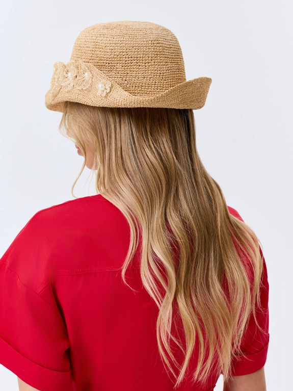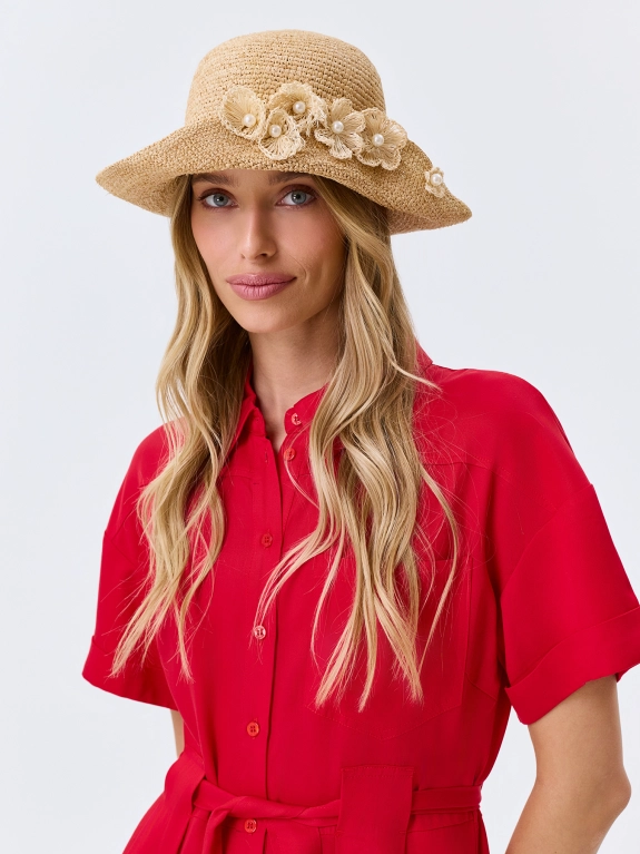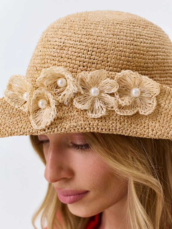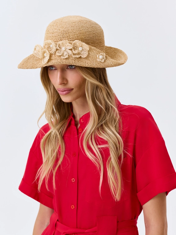 Шляпа из 100% рафии с флоральным декором. Округлая тулья, длинные немного опущенные поля. Задняя часть загнута к тулье и дополнена акцентным декором из вязаных цветов и жемчужин. Регулировка размера с помощью внутренней кулисы.