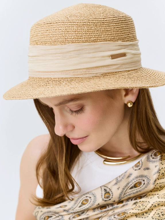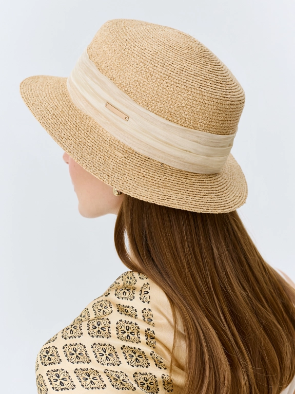 Шляпа-канотье из 100% рафии с декоративной лентой. Классическая канотье с жесткими полями. Дополнена декоративной лентой. Регулировка размера с помощью внутренней кулисы.