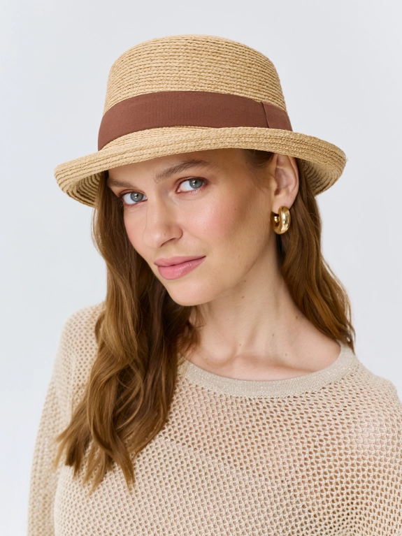Шляпа-канотье из 100% рафии с загнутыми полями. Классическая канотье с жесткими полями. Дополнена декоративной лентой. Регулировка размера с помощью внутренней кулисы.