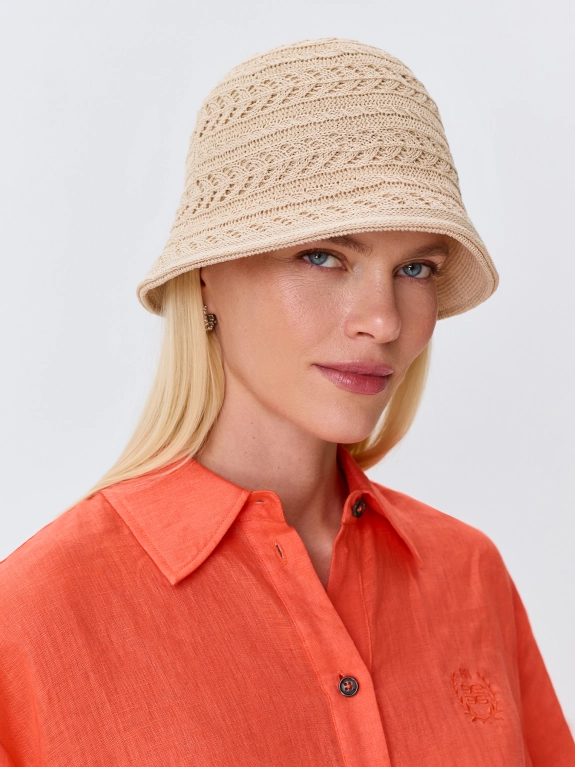 Классическая вязаная панама. Закругленная тулья и короткие опущенные поля. Регулировка размера с помощью внутренней кулисы.