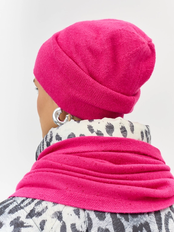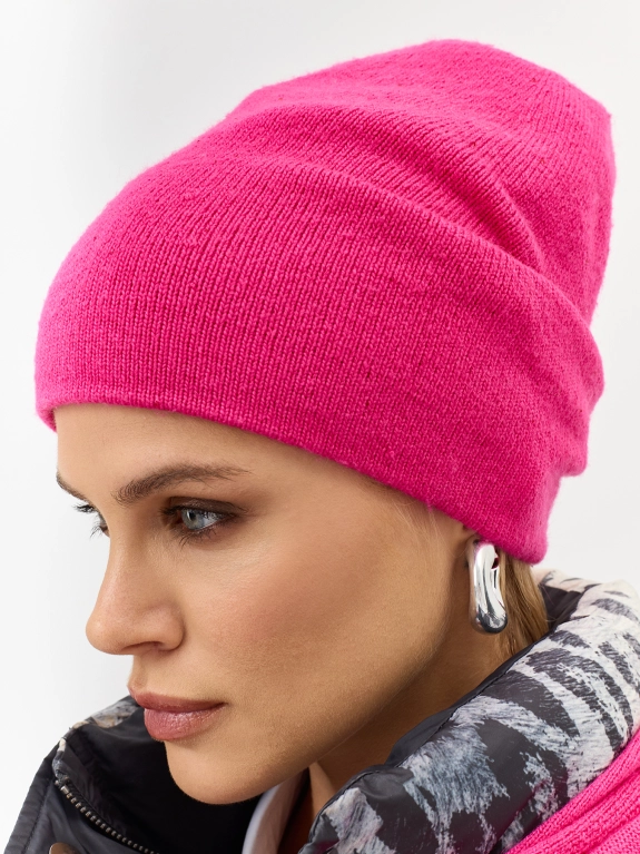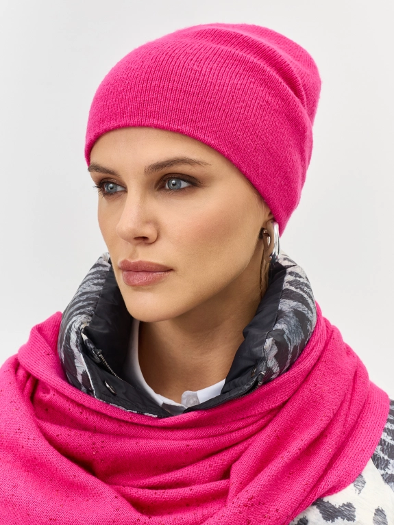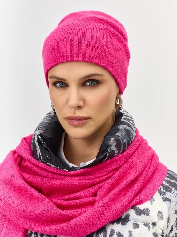 Тонкая шапка свободного объёма с деликатными пайетками в тон пряжи. Вискоза и ангора в составе.