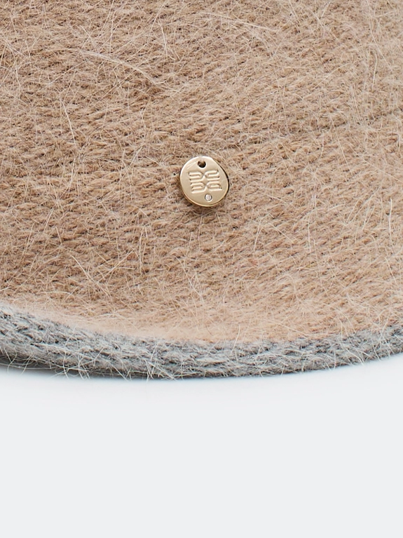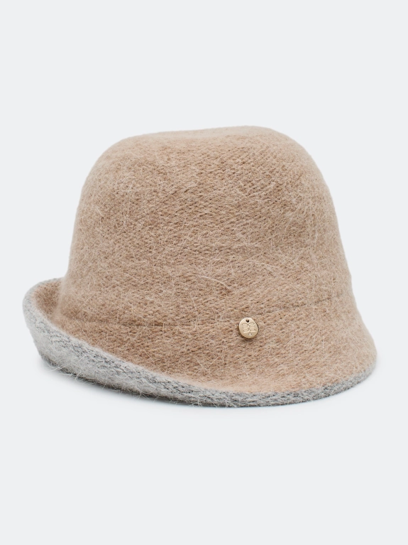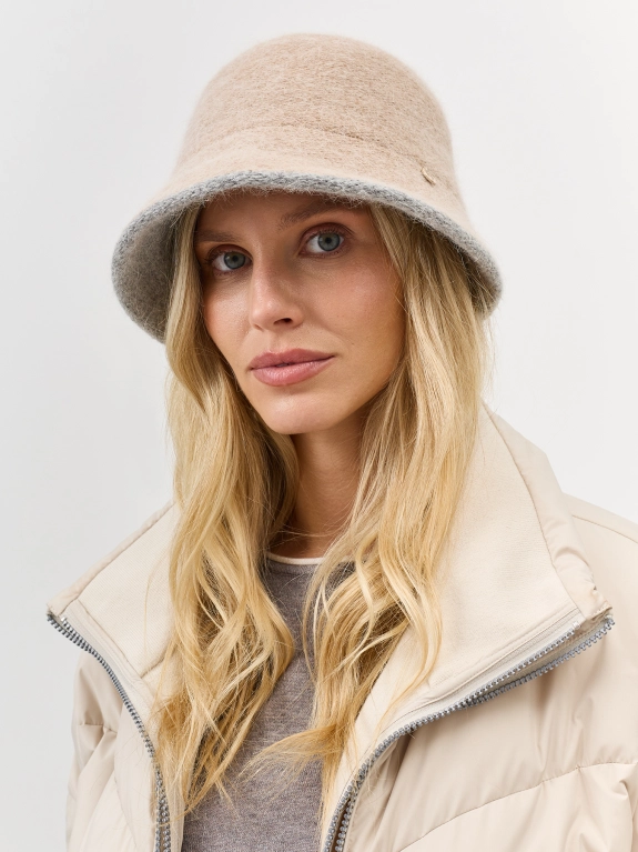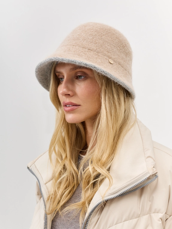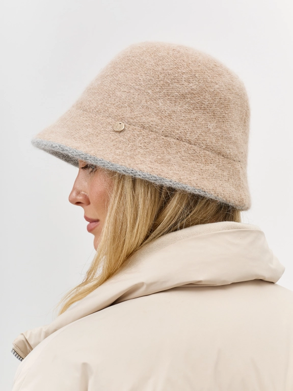 Вязаная шляпа с ангорой в составе. Риб по внутренней стороне для лучшей фиксации и регулировки размера. Узкие асимметричные поля с контрастным отворотом. Дополнена минималистичным металлическим брендированным шильдом.