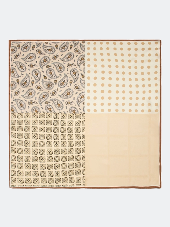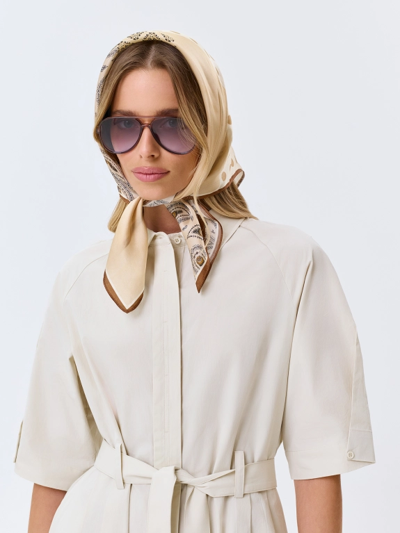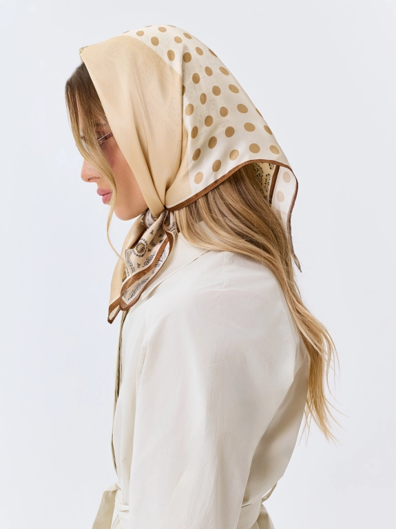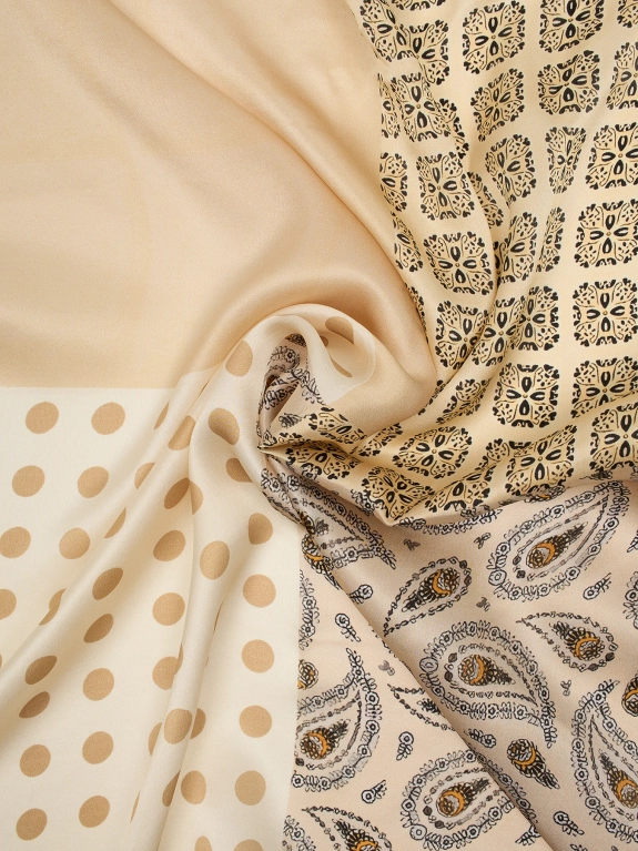 Легкий шейный платок с деликатным принтом. В составе 100% шелк. Можно повязать на сумку, использовать как бандану или повязать на шею.