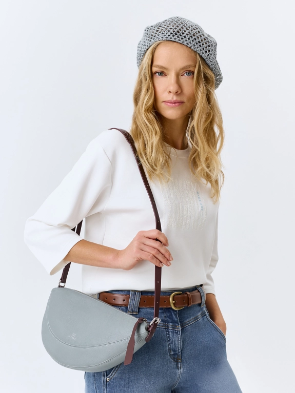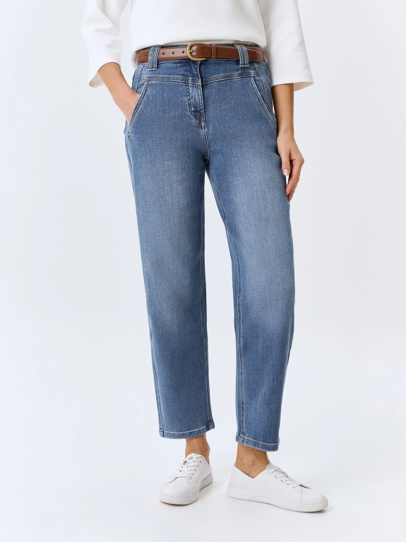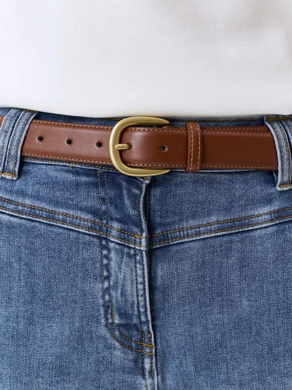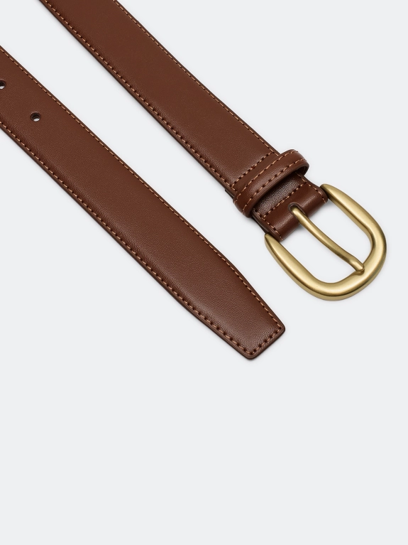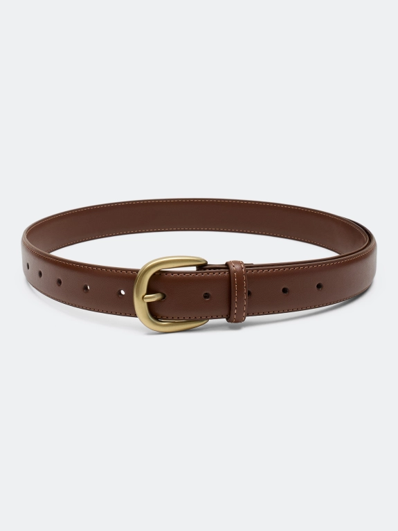 Коричневый ремень из натуральной кожи. Дополнен круглой пряжкой.