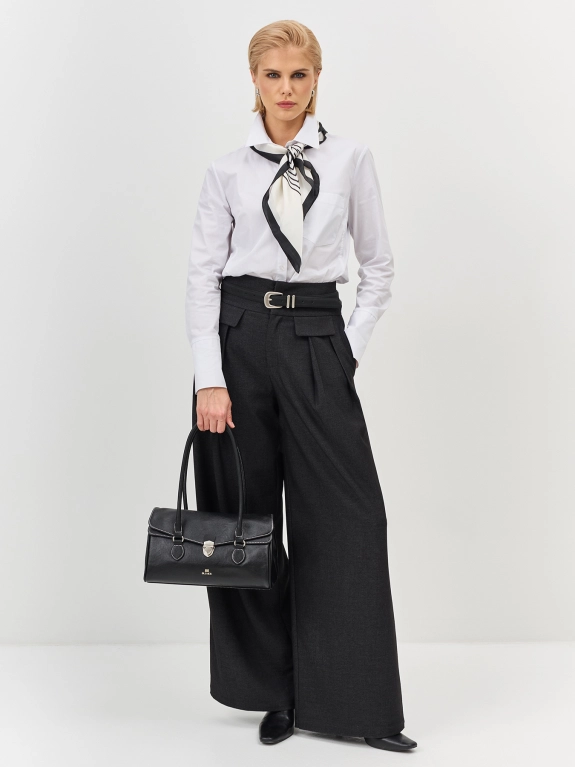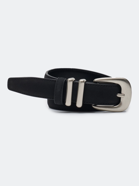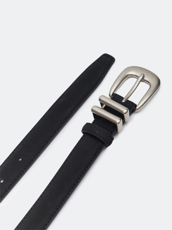 Кожаный ремень с металлическими шлевками и овальной пряжкой.