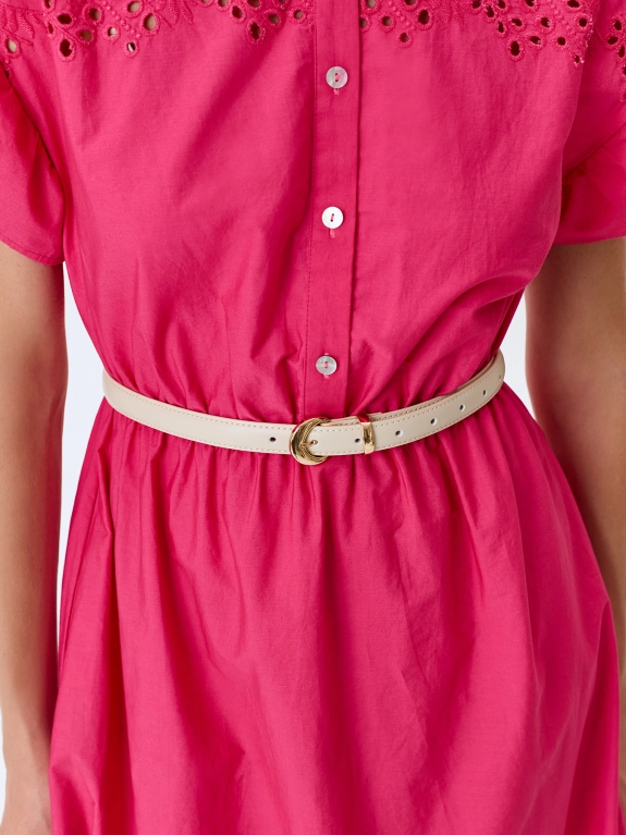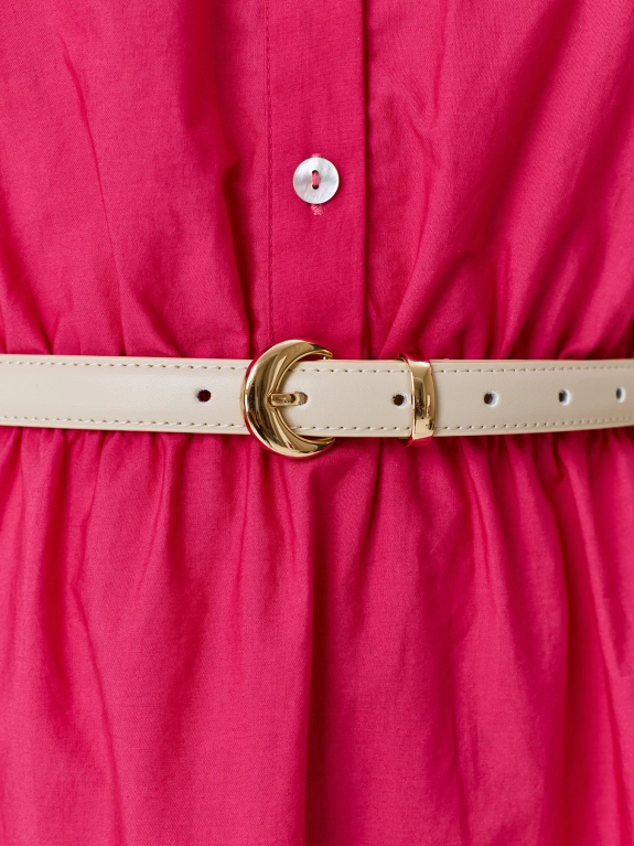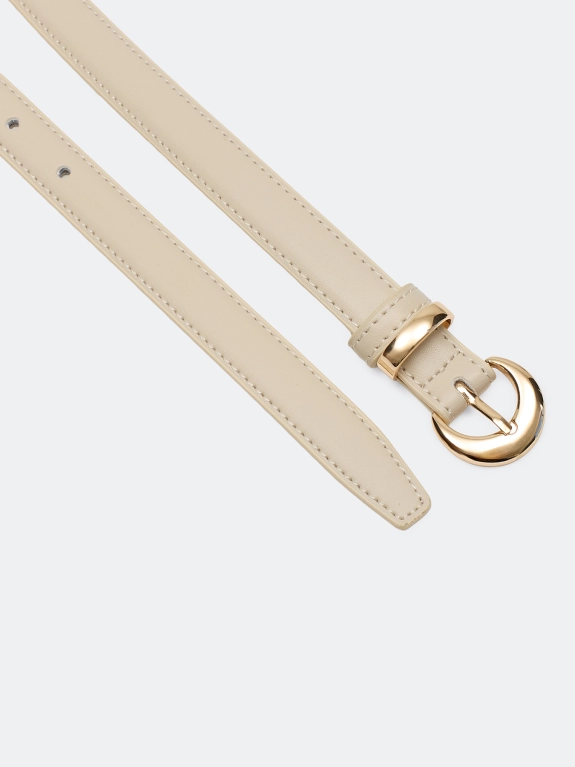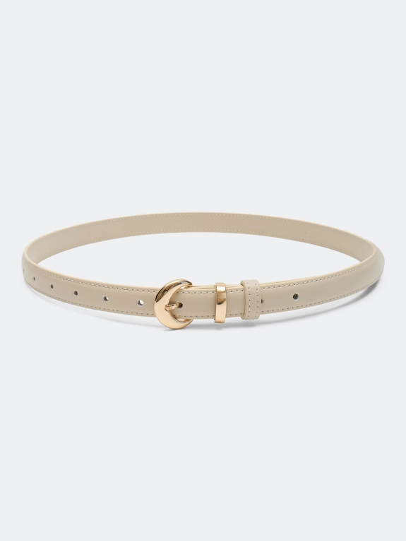 Узкий ремень из натуральной кожи с акцентной фигурной пряжкой.