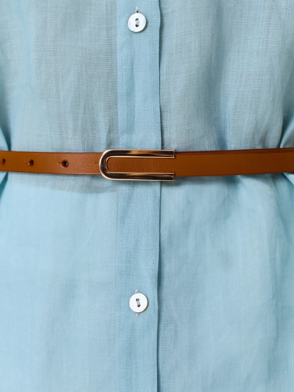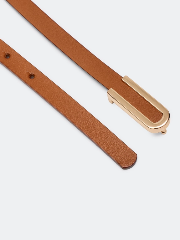 Узкий ремень из натуральной кожи с акцентной фигурной пряжкой.