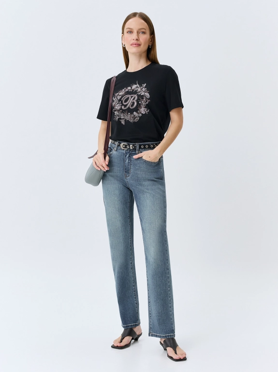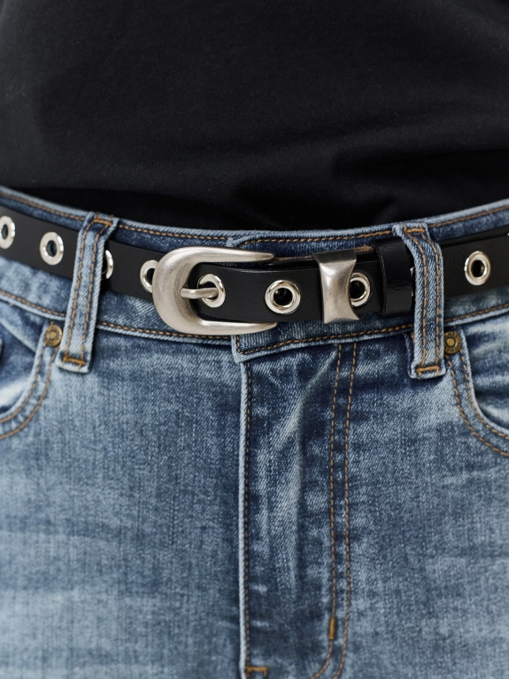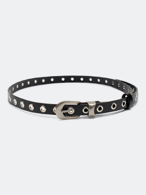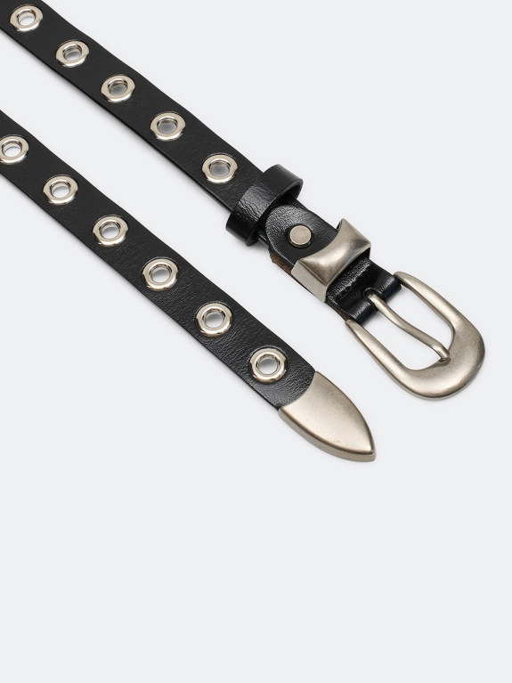 Узкий ремень из натуральной кожи с декоративными люверсами по всей длине и металлическим наконечником. Дополнен круглой пряжкой.