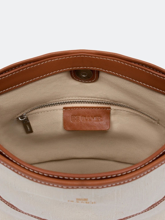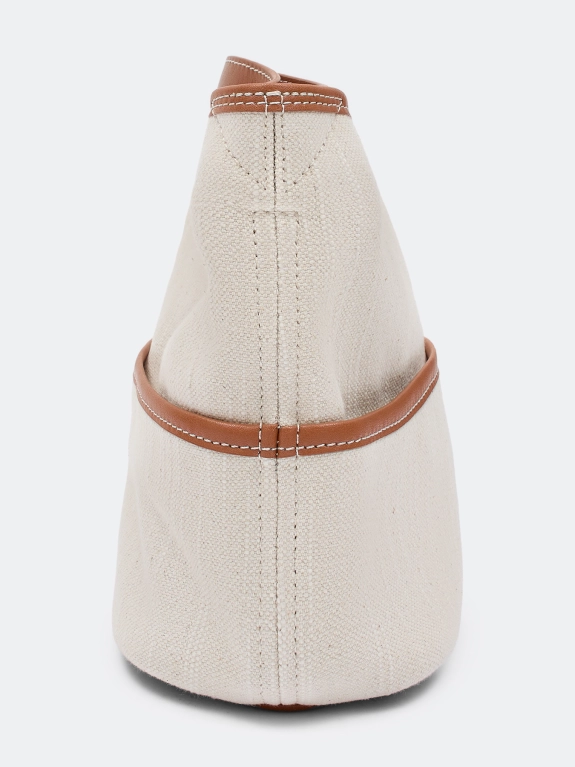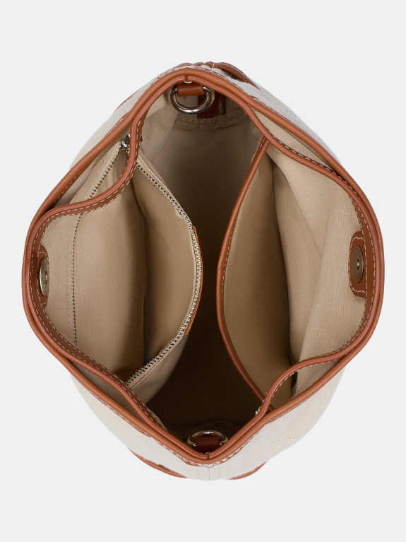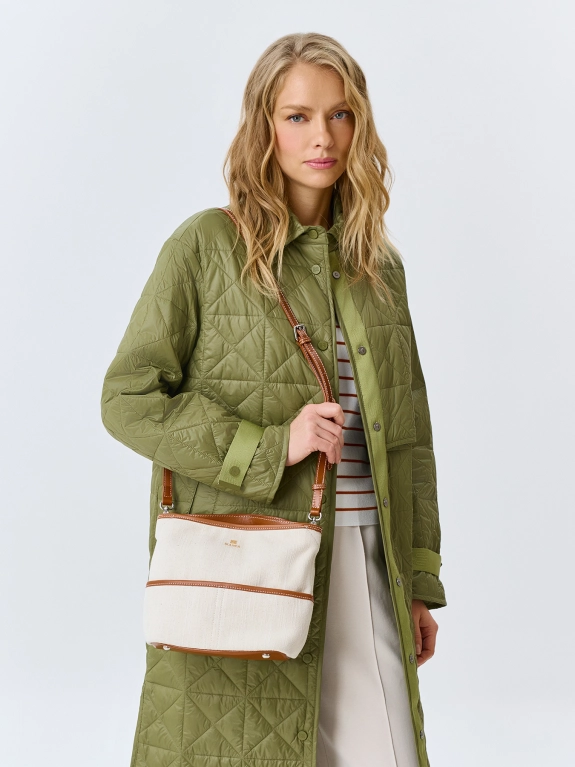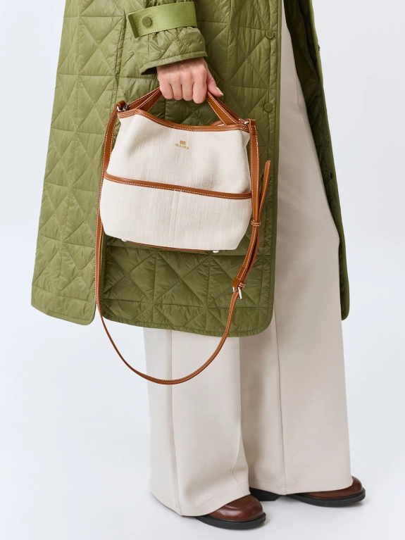 Комбинированная льняная сумка с деталями из натуральной кожи. Одно вместительное отделение с внутренними карманами. Наружные декоративные карманы. Две короткие ручки и длинный регулируемый ремешок. Дополнена пуклями по низу для устойчивости.