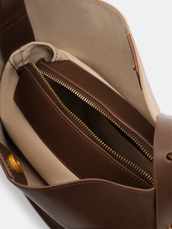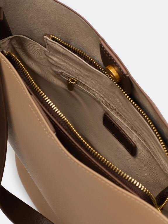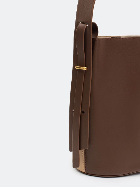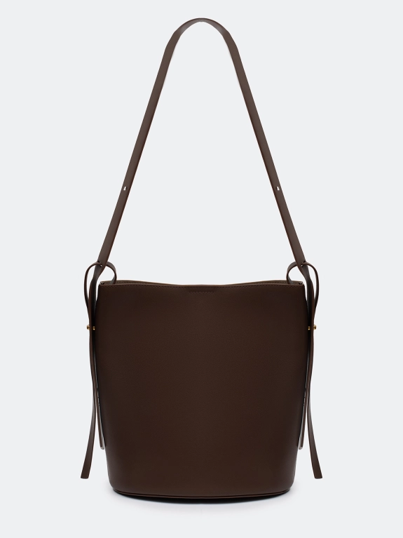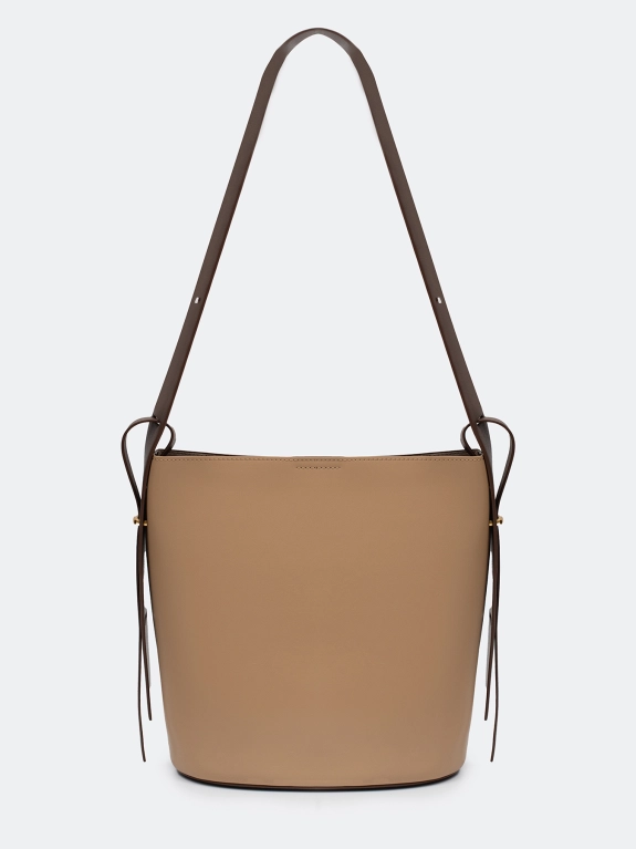 Кожаная двусторонняя сумка-мешок. Длинный ремень в комплекте. Контрастная внешняя сторона. Одно вместительное отделение.
