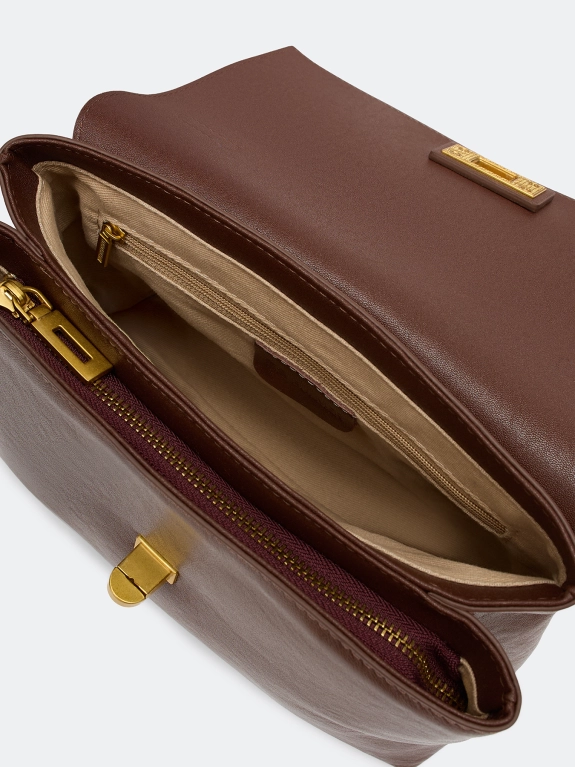 Сумка кросс-боди из натуральной кожи с фурнитурой в цвете античное золото. Два отделение с застежкой на молнию. Клапан с поворотным замком. Длинный регулируемый ремешок в комплекте.