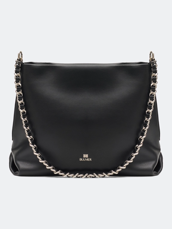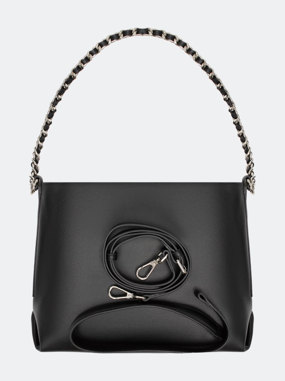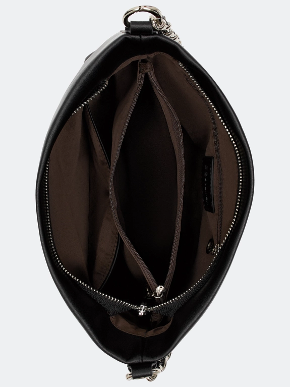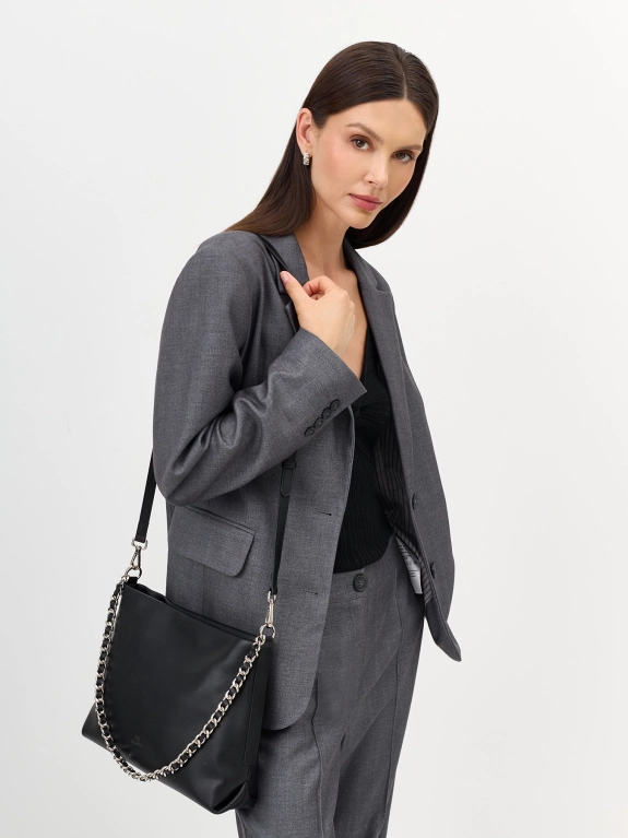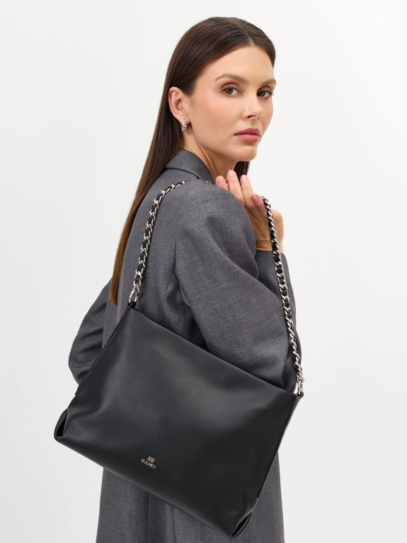 Сумка из натуральной глянцевой кожи со съёмной ручкой-цепочкой в комплекте. Одно вместительное отделение и потайной карман на молнии. Застежка на молнию. Длинный регулируемый ремешок в комплекте.