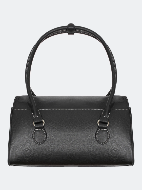 Сумка из натуральной кожи с клапаном и цупферным замком. Контрастная отстрочка. Одно вместительное отделение и потайной карман на молнии. Две ручки соединены хлястиком с кнопкой.