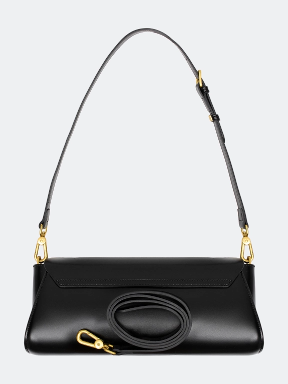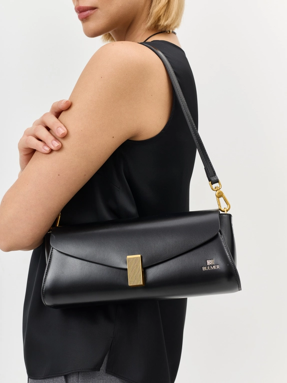 Мини сумка багет из натуральной глянцевой кожи. Одно вместительное отделение и потайной карман на молнии. Застежка на клапан и поворотный механизм. Короткая регулируемая ручка и длинный регулируемый ремешок в комплекте.