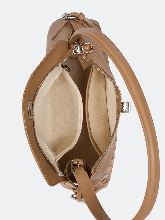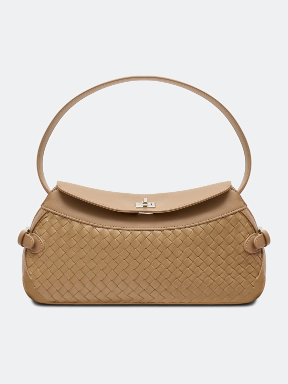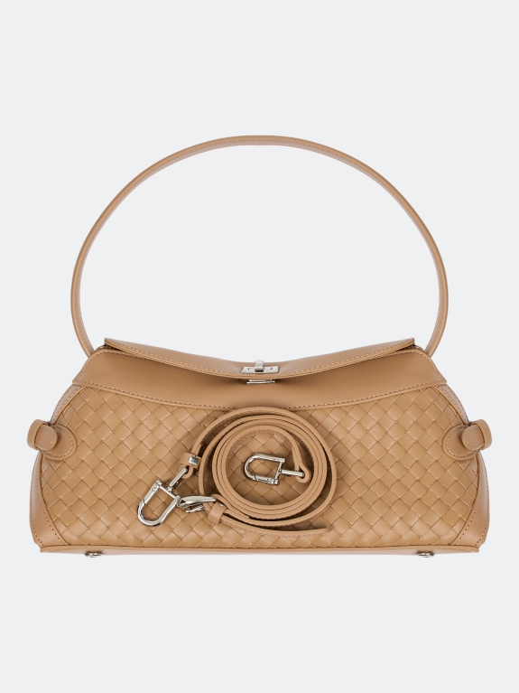 Плетеная сумка кроссбоди из натуральной кожи. Одно вместительное отделение с внутренними карманами. Застежка на молнию, клапан и поворотный механизм. Одна короткая ручка и длинный регулируемый ремешок.