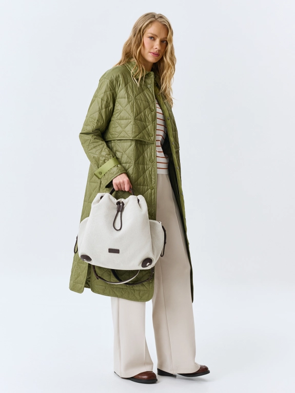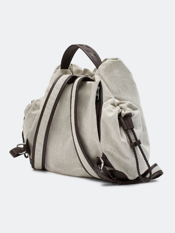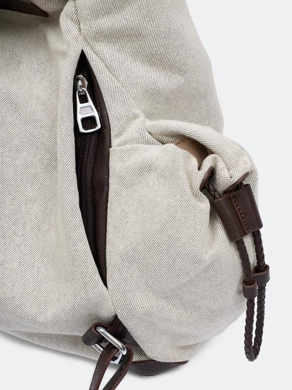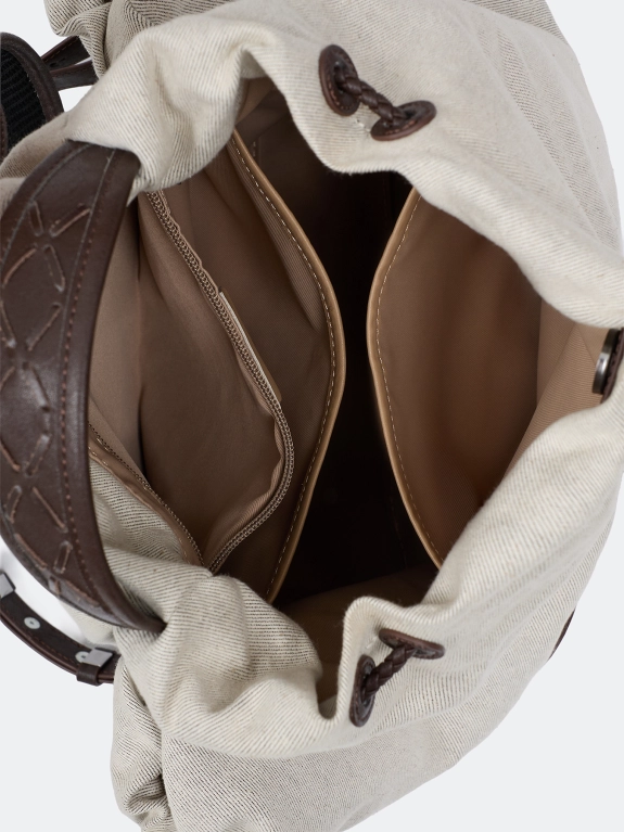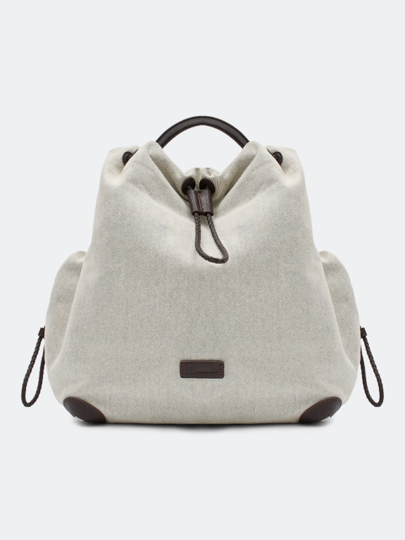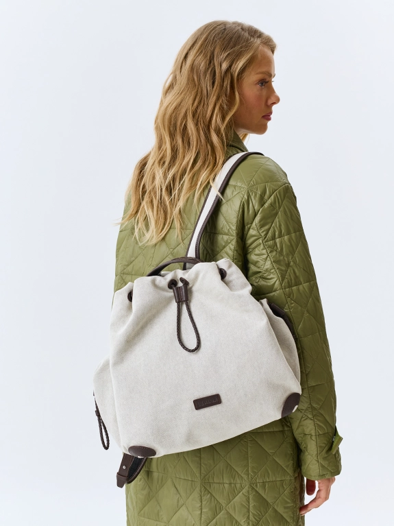 Рюкзак из текстиля с контрастными деталями из натуральной кожи. Одно вместительное отделение и два боковых кармана на кулисе. Одна короткая ручка и две регулируемые плечевые лямки. Застежка на кулису.