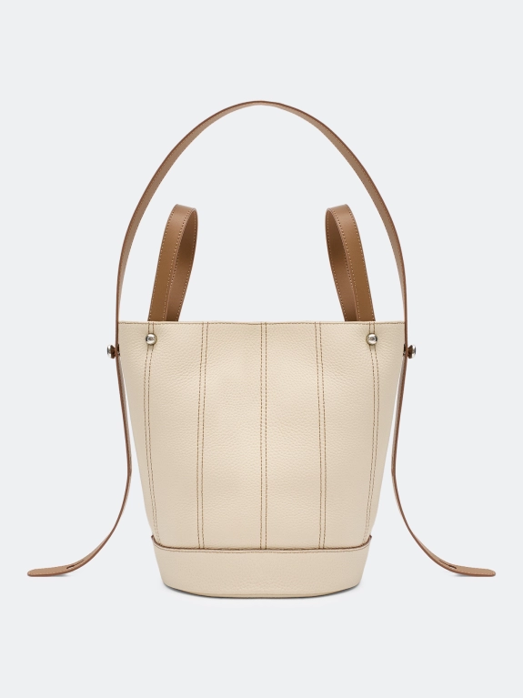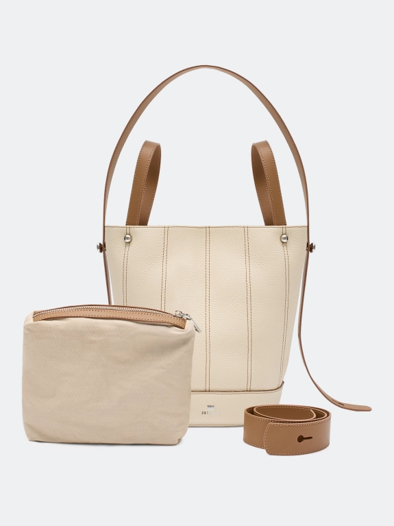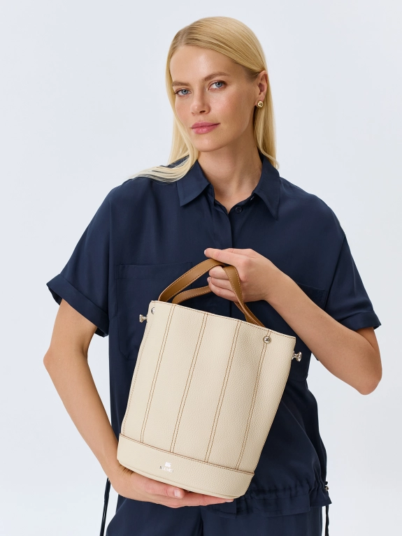 Комплект сумка-ведро из натуральной кожи и косметичка. Одно вместительное отделение с контрастными отстрочками. Две короткие ручки и длинный ремешок из контрастной кожи. Короткие ручки можно убрать внутрь. Застежка на кнопку. Косметичка с одним вместительным отделением на молнии.
