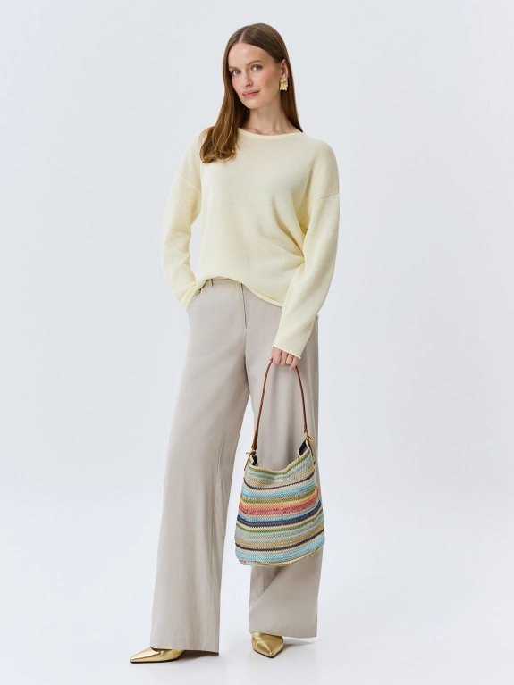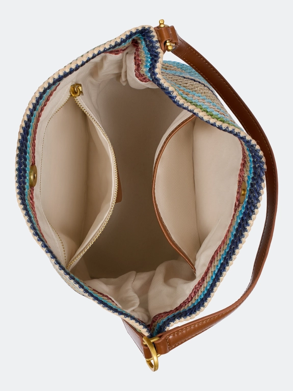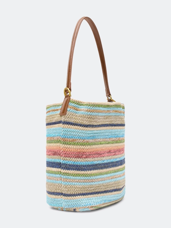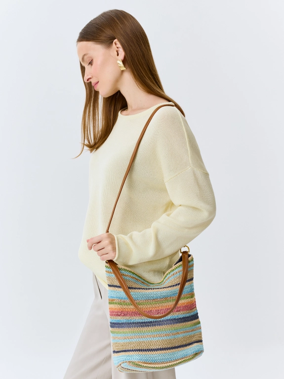 Комплект: яркая плетеная сумка в полоску и косметичка. Одно вместительное отделение, внутренние карманы. Застежка на магнитную кнопку. Длинный ремешок. Косметичка в монохромную полоску с одним вместительным отделением на кулисе.