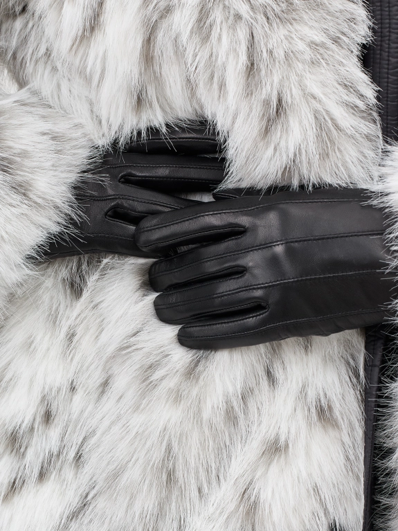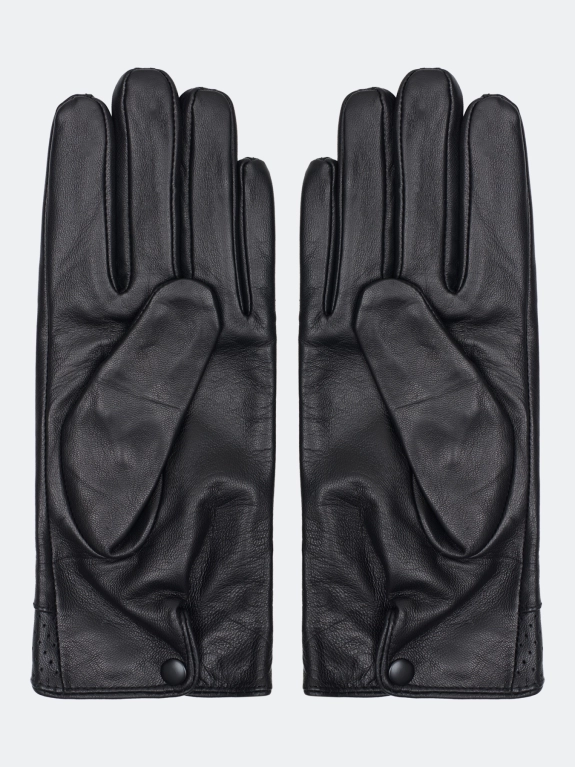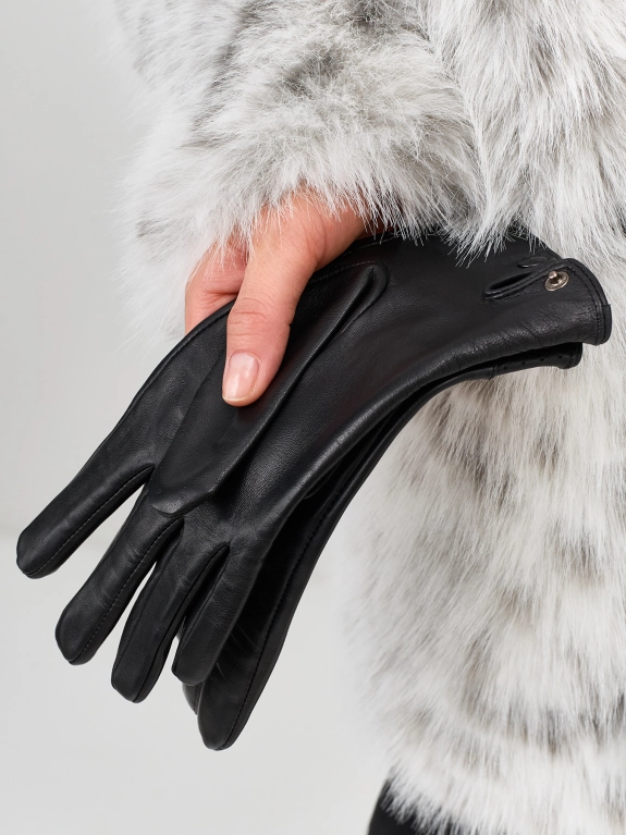 Перчатки из мягкой натуральной кожи с фактурной выделкой. Украшены застрочками и перфорацией по краю. Застежка на кнопку с внутренней стороны для лучшей фиксации. Теплая текстильная подкладка.
