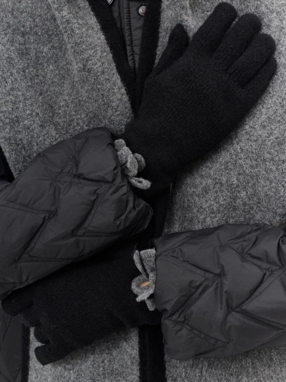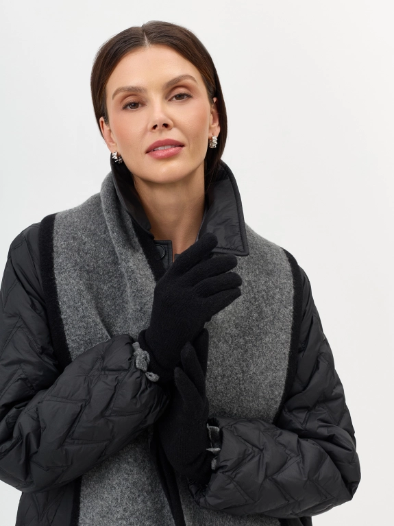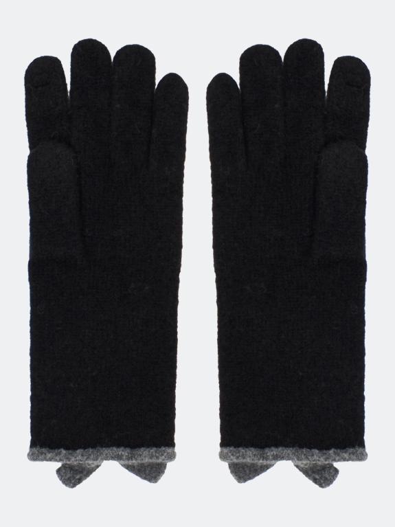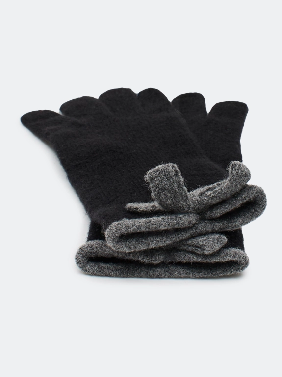 Вязаные перчатки из фасонной ворсистой пряжи с добавлением шерсти. Контрастная окантовка и бантик. Украшены металлическим шильдиком. Комплект с шарфом BLMR302514