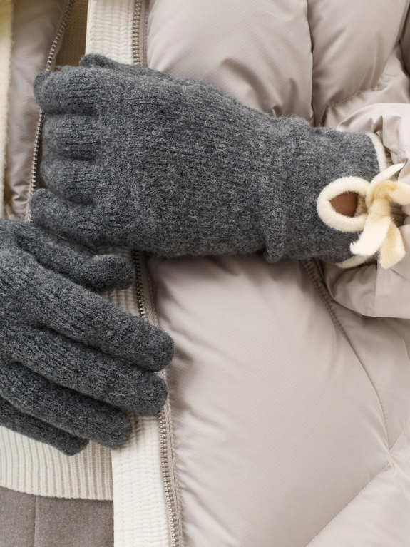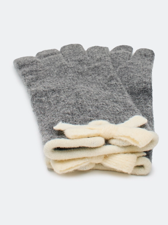 Вязаные перчатки из фасонной ворсистой пряжи с добавлением шерсти. Контрастная окантовка и бантик. Украшены металлическим шильдиком. Комплект с шарфом BLMR302517