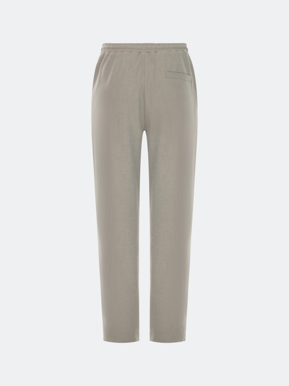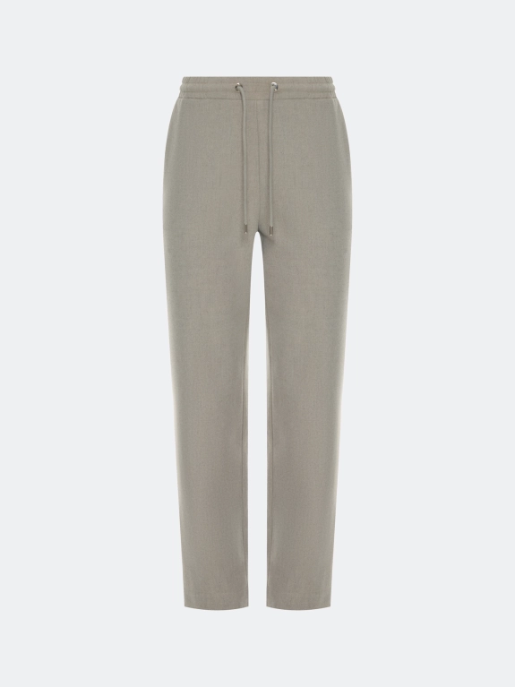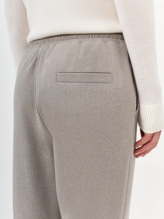 Текстильные брюки-джоггеры с шерстью в составе. Прямой силуэт. Резинка и шнурок по линии талии. Боковые карманы в швах. Задний прорезной карман. Дополнены шелковистой подкладкой.