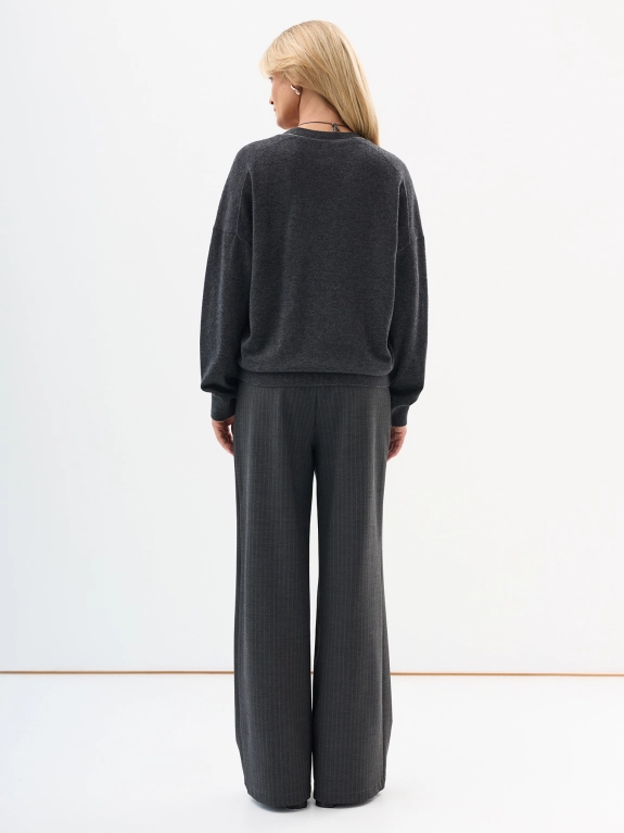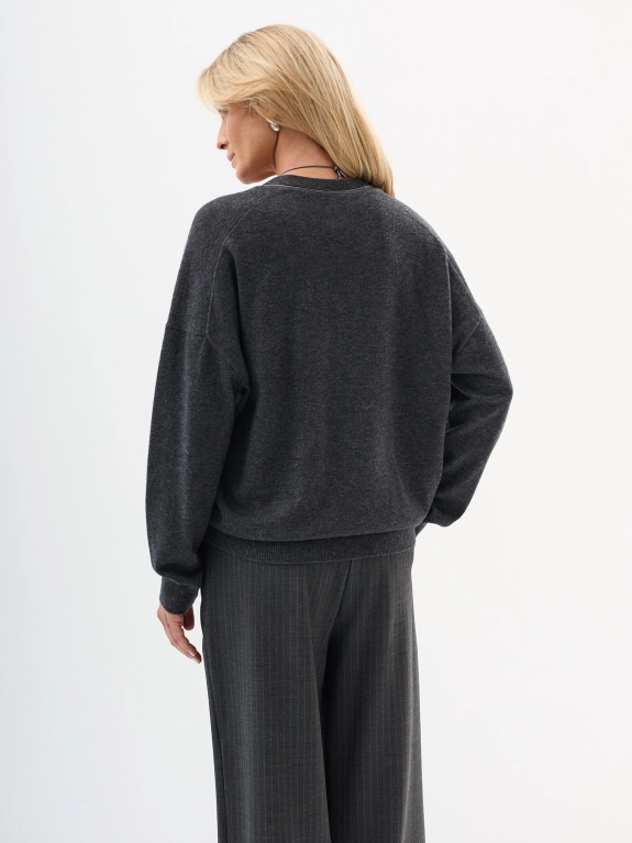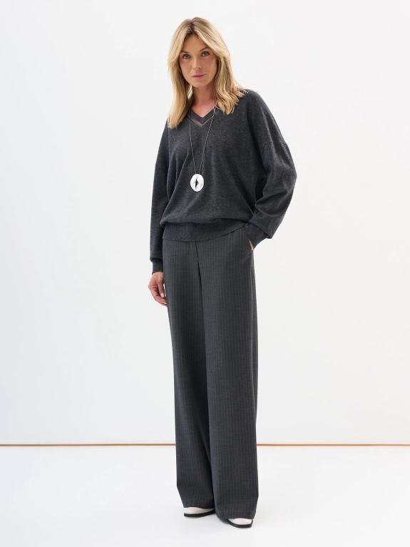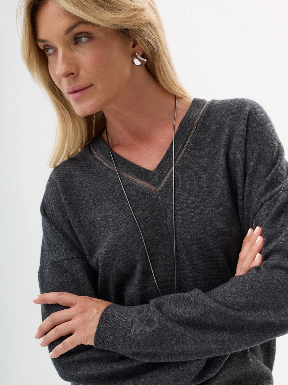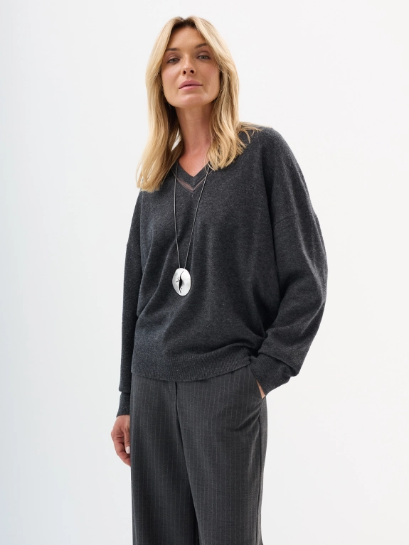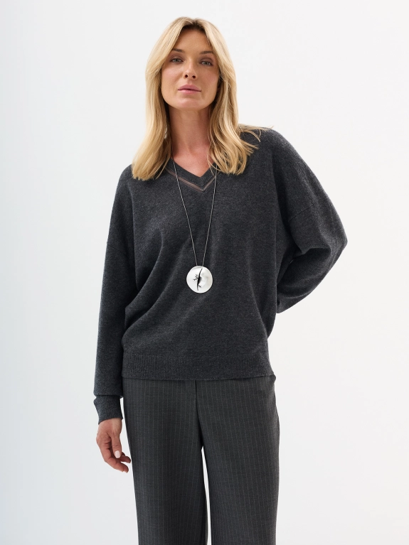 Джемпер с V-образным вырезом и шерстью в составе. Свободный силуэт. Спущенное плечо. Акцентные вставки из прозрачной сетки.