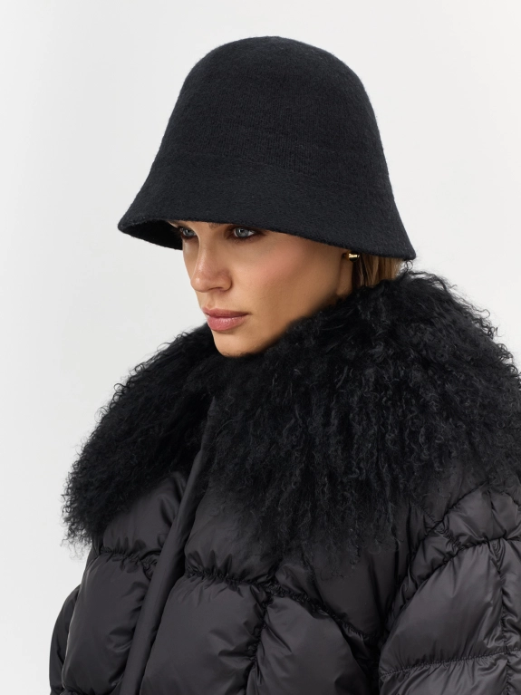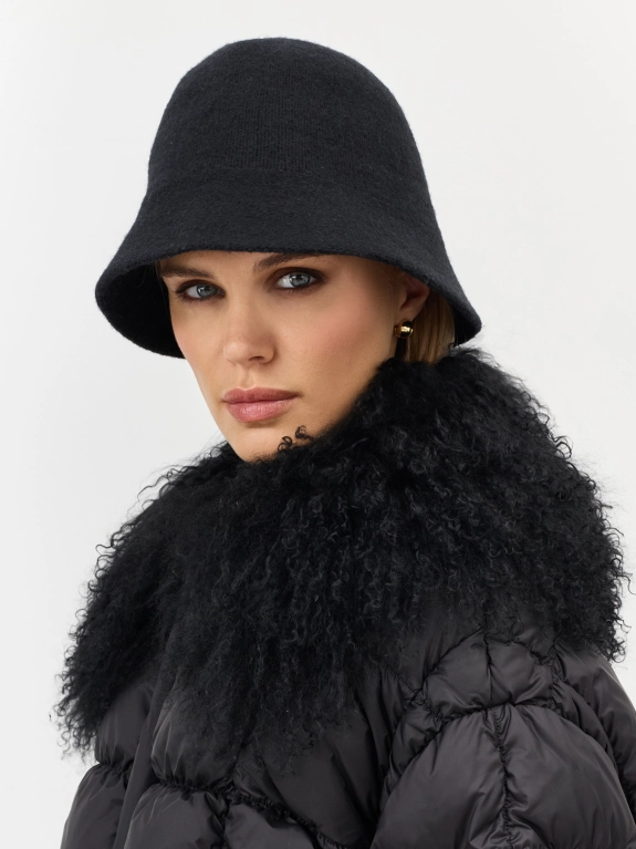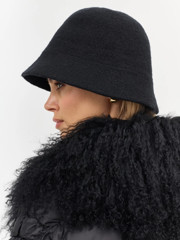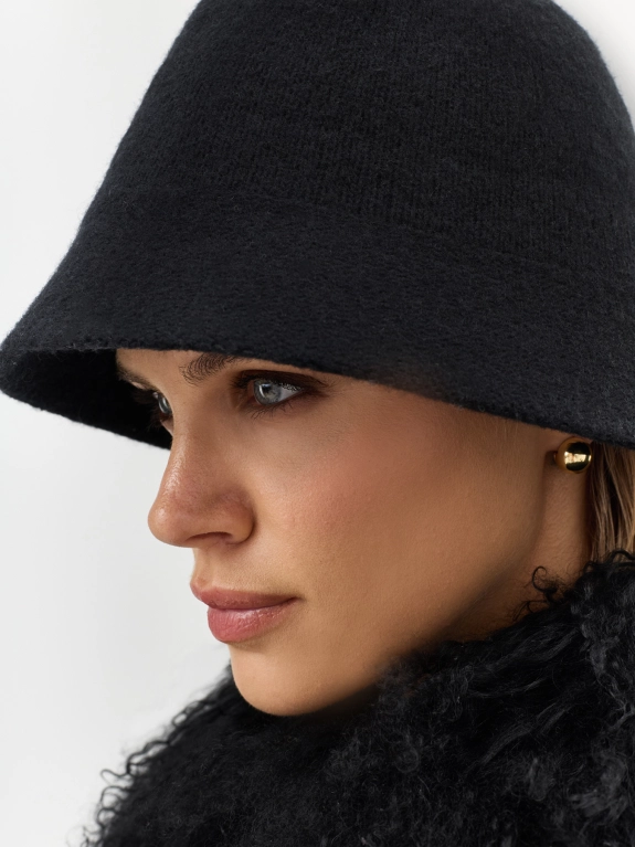 Вязаная шляпа с узкими полями из шерстяной пряжи. Риб по внутренней стороне изделия для лучшей фиксации и регулировки размера.