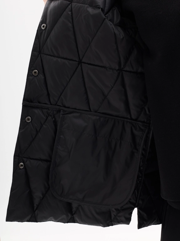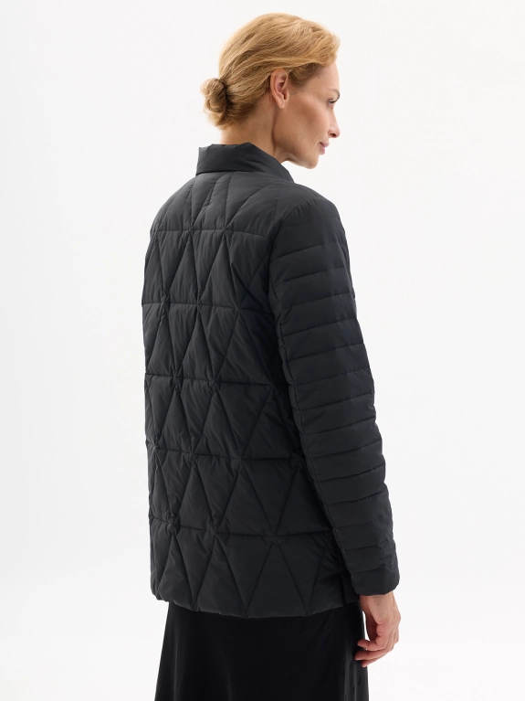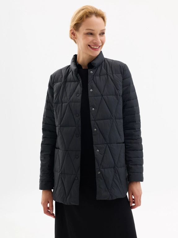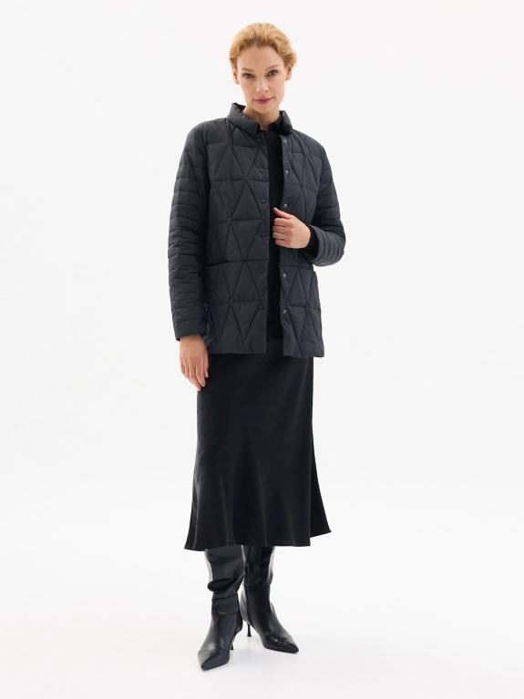 Осенняя куртка с ромбовидной стежкой. Прямой силуэт. Воротник стойка. Боковые карманы на скрытых молниях. Застежка на кнопки.