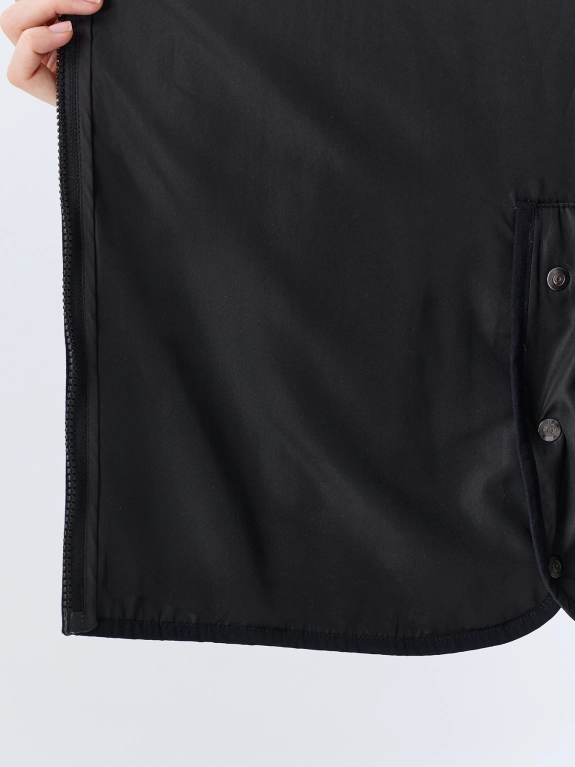 Легкий бомбер с вертикальной сквозной стежкой. Прямой силуэт. Трикотажный воротник стойка. Застежка на молнию. Длину втачных рукавов можно регулировать отворотом. Боковые карманы на молниях. Боковые шлицы на функциональных кнопках. Отделка трикотажным рибом по краю.