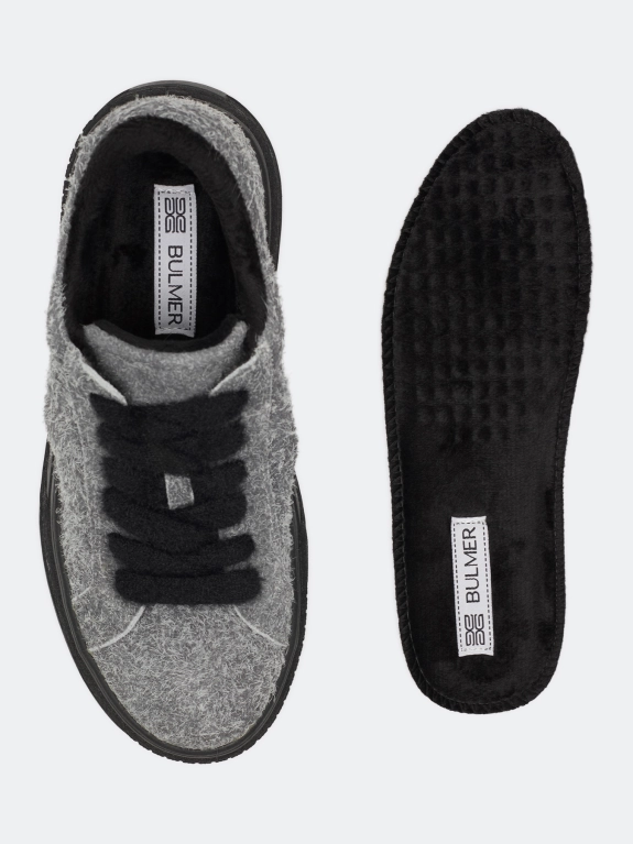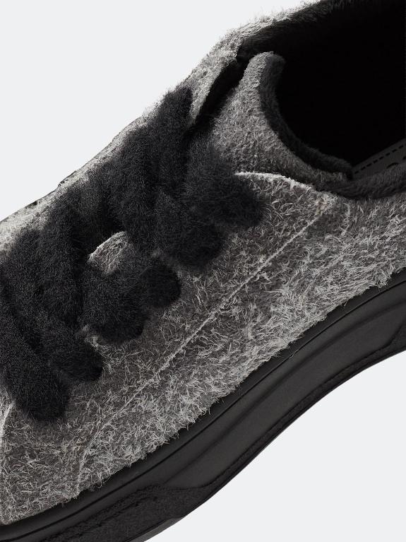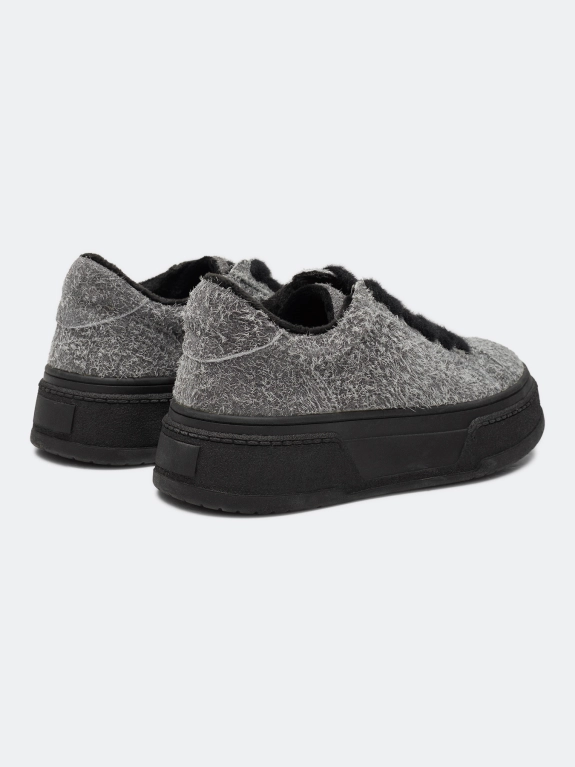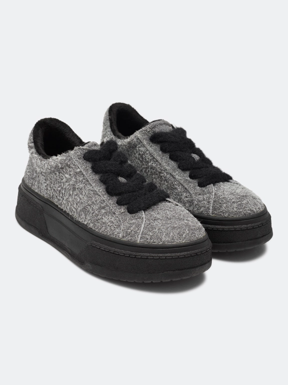 Кеды из натуральной фактурной ворсистой замши. Фиксация на контрастные пушистые шнурки. Подкладка из теплого текстиля. Фактурная контрастная подошва из термопластичной резины.