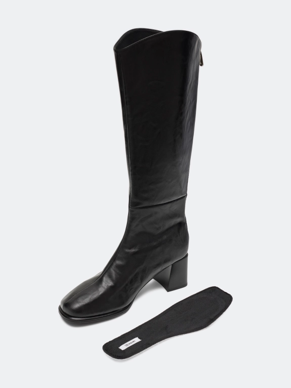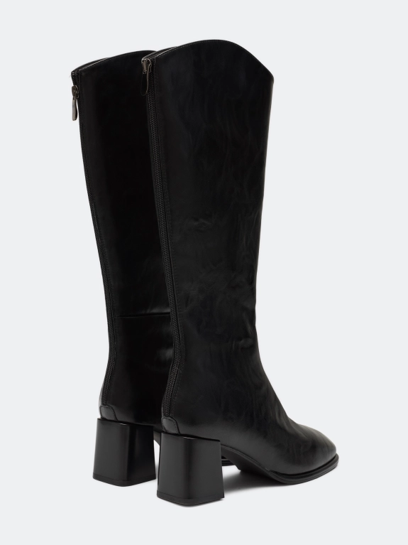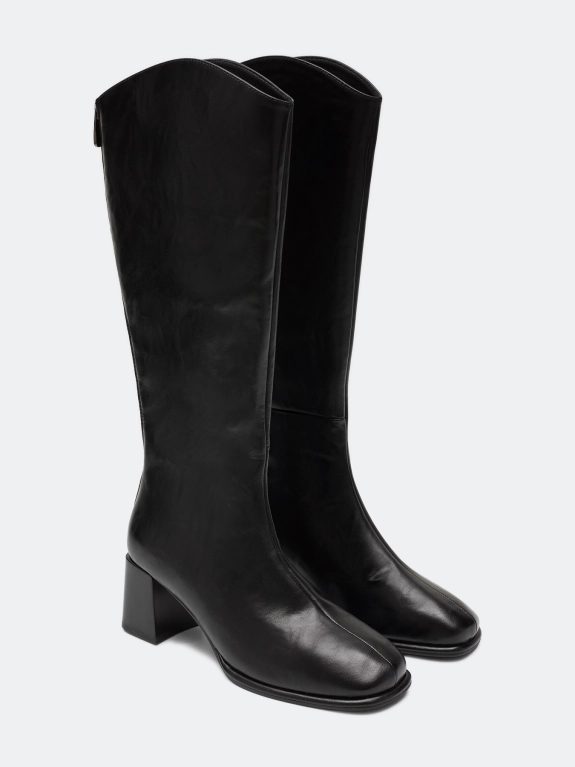 Классические сапоги из натуральной глянцевой кожи с тонкой подошвой и устойчивым квадратным каблуком. Слегка зауженный мыс. Застежка на молнию сзади. Подкладка и стелька из теплого текстиля.