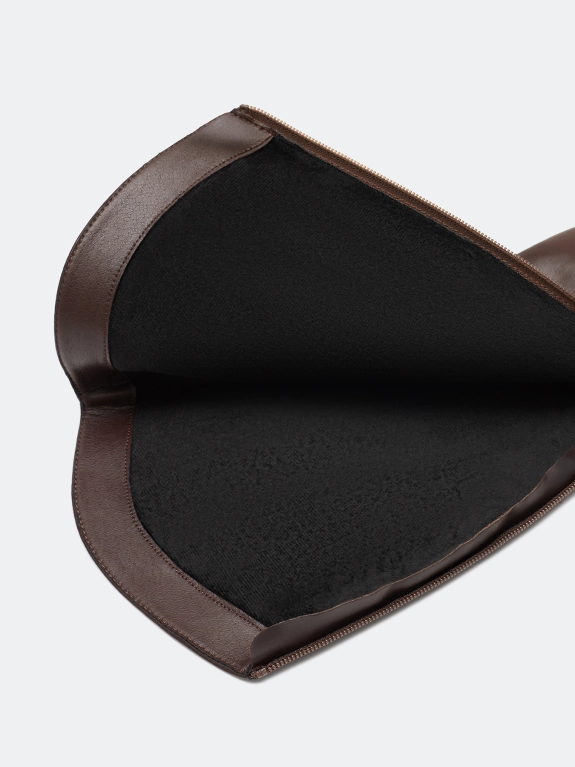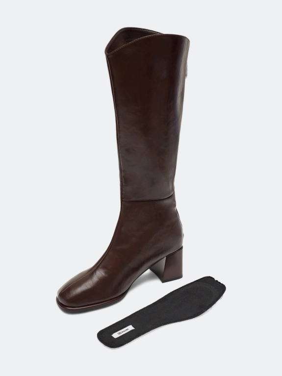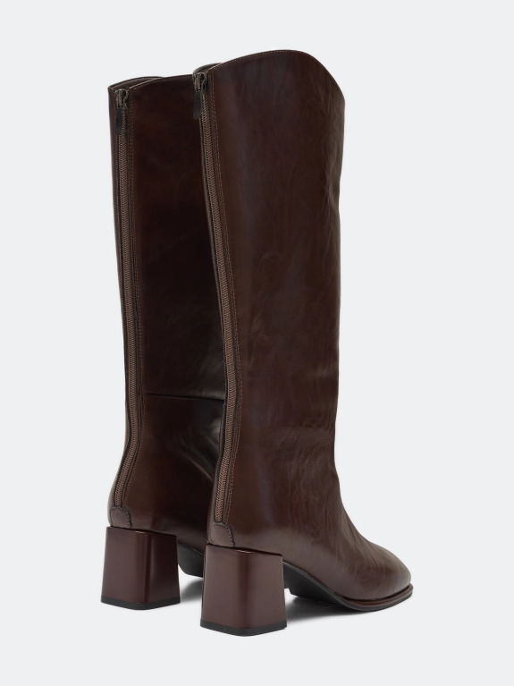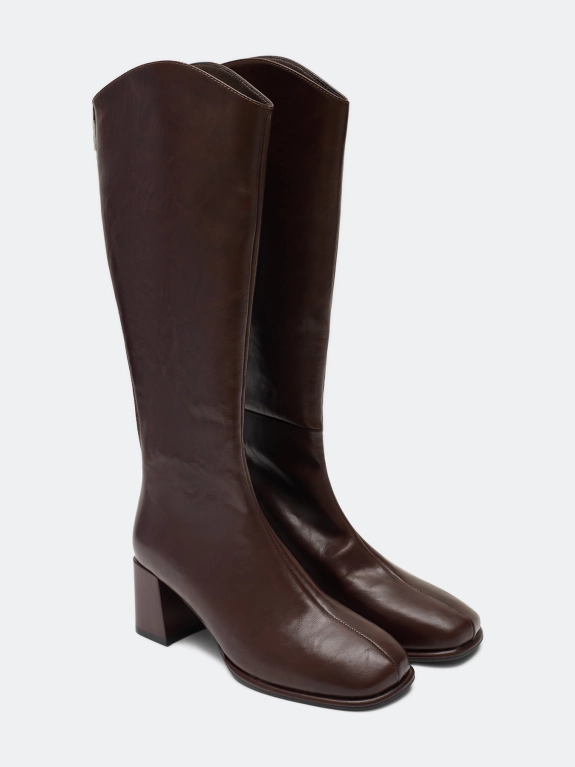 Классические сапоги из натуральной глянцевой кожи с тонкой подошвой и устойчивым квадратным каблуком. Слегка зауженный мыс. Застежка на молнию сзади. Подкладка и стелька из теплого текстиля.
