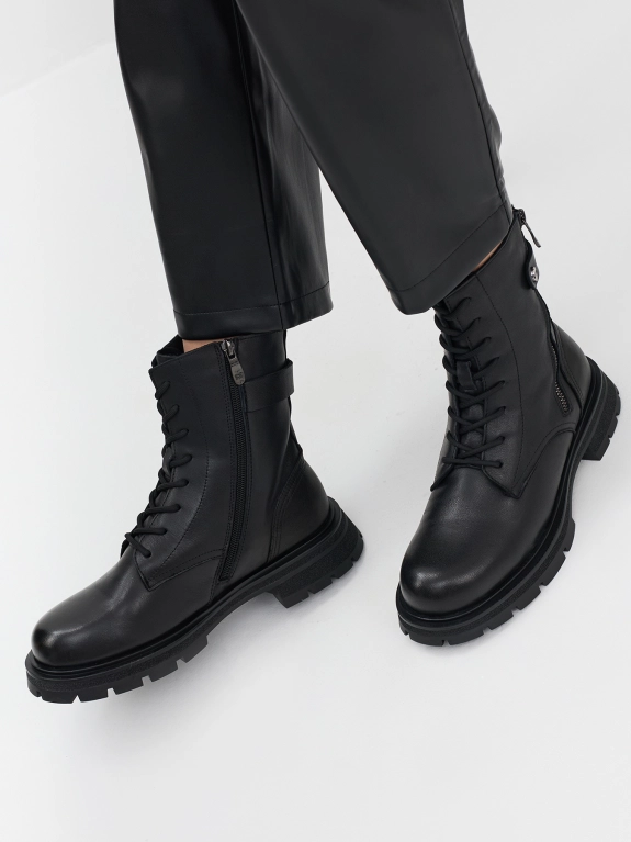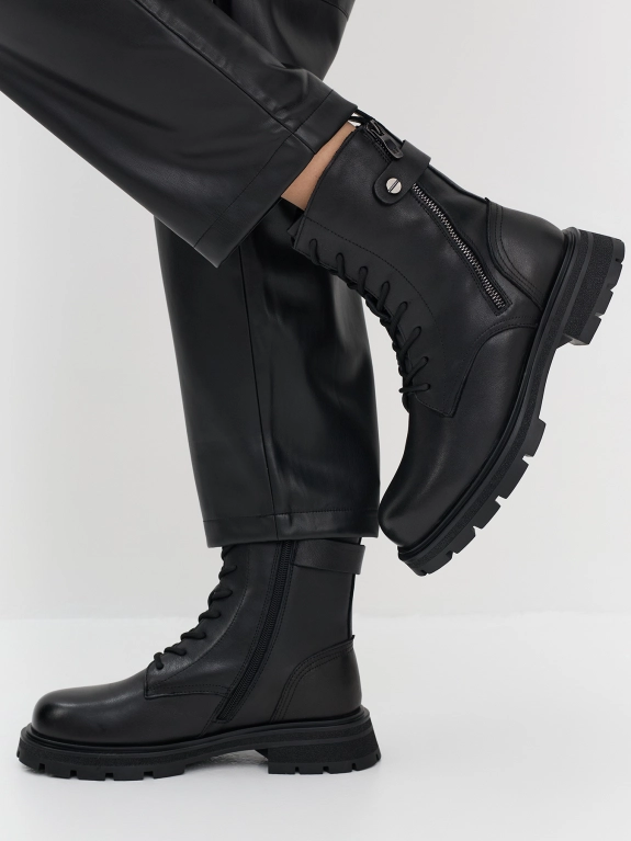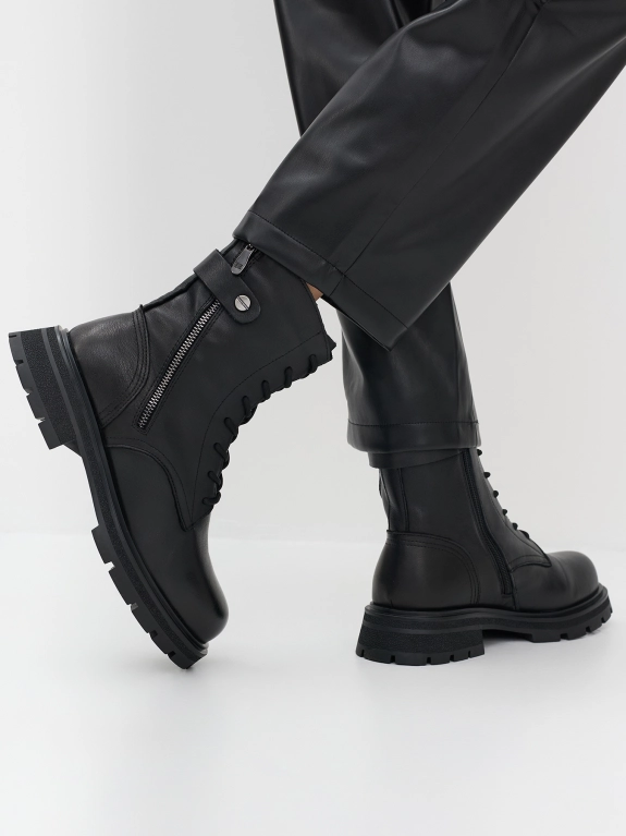 Высокие утепленные кожаные ботинки. Закругленный мыс. Застежка молния с внутренней стороны. Рифленая термопластичная подошва с устойчивым каблуком. Подкладка из натуральной шерсти. Контрастная молния с внешней стороны.