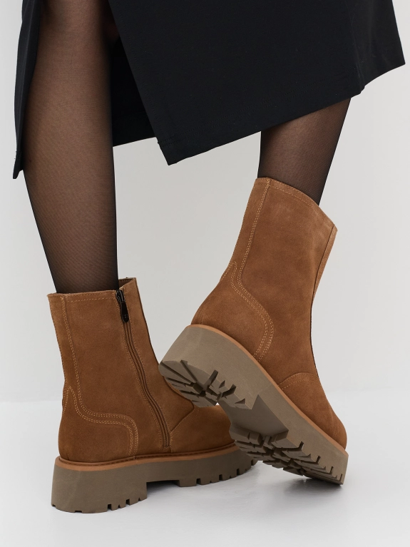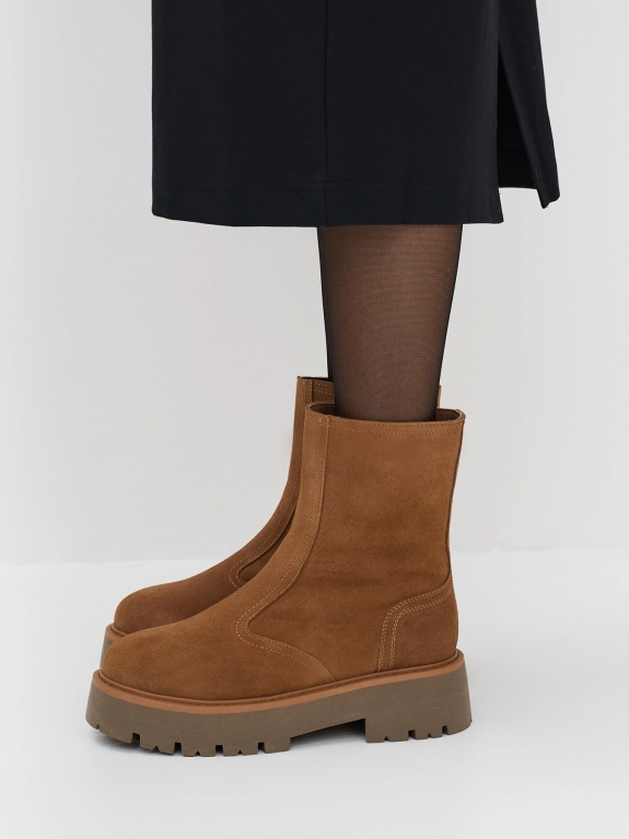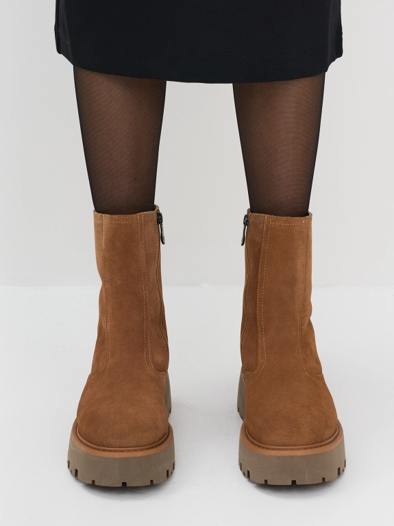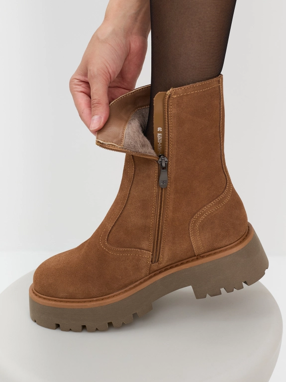 Утепленные полусапожки из натуральной замши. Круглый мыс. Высокая подошва из термопластичной резины. Застежка молния с внутренней стороны. Подкладка из натуральной шерсти.