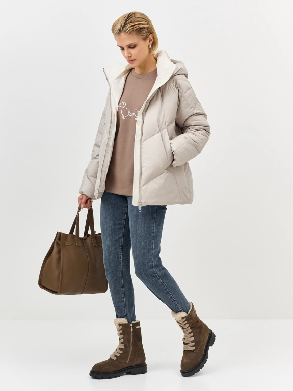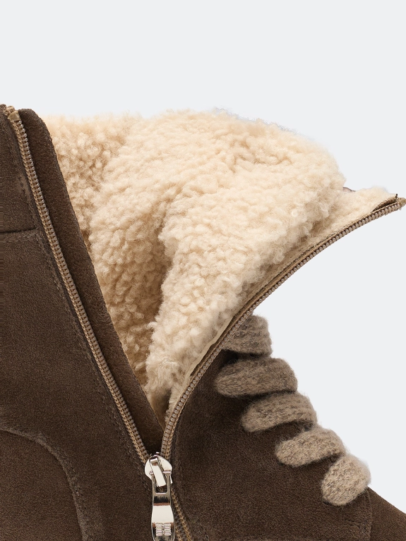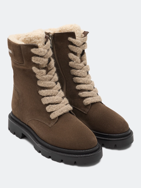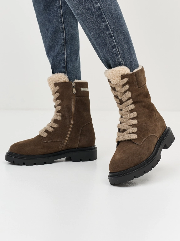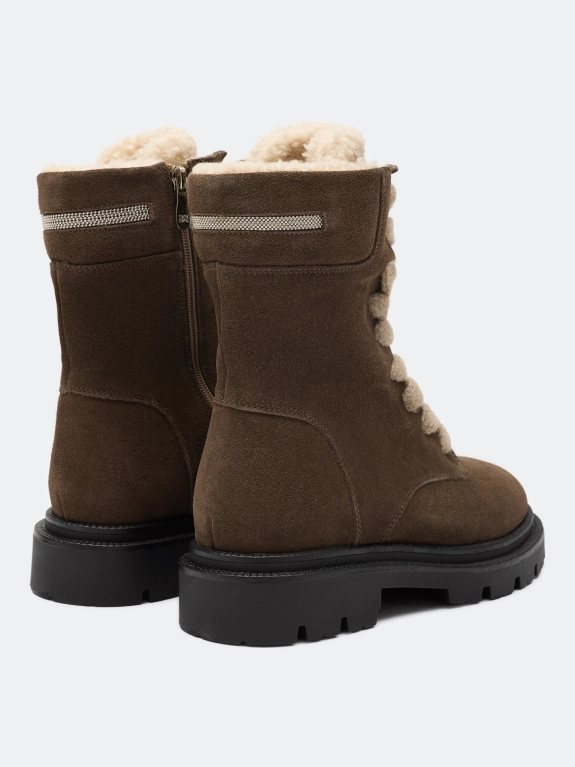 Ботинки из натуральной замши с объёмными шнурками. Закругленный мыс. Застёжка на молнию с внутренней стороны. Отделка из нескольких цепочек металлической монили. Подкладка и стелька из искусственного меха. Высокая рифленая подошва и каблук из термопластичной резины.